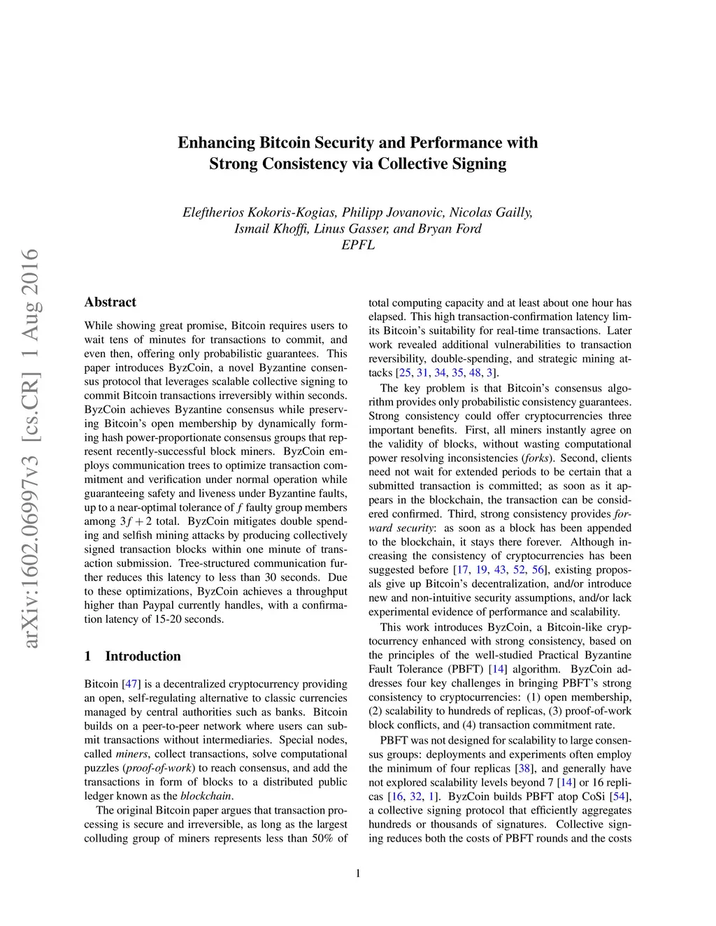 While showing great promise, Bitcoin requires users to wait tens of minutes for transactions to commit, and even then, offering only probabilistic guarantees. This paper introduces ByzCoin, a novel Byzantine consensus protocol that leverages scalable collective signing to commit Bitcoin transactions irreversibly within seconds. ByzCoin achieves Byzantine consensus while preserving Bitcoin's open membership by dynamically forming hash power-proportionate consensus groups that represent recently-successful block miners. ByzCoin employs communication trees to optimize transaction commitment and verification under normal operation while guaranteeing safety and liveness under Byzantine faults, up to a near-optimal tolerance of f faulty group members among 3f + 2 total. ByzCoin mitigates double spending and selfish mining attacks by producing collectively signed transaction blocks within one minute of transaction submission. Tree-structured communication further reduces this latency to less than 30 seconds. Due to these optimizations, ByzCoin achieves a throughput higher than PayPal currently handles, with a confirmation latency of 15-20 seconds.