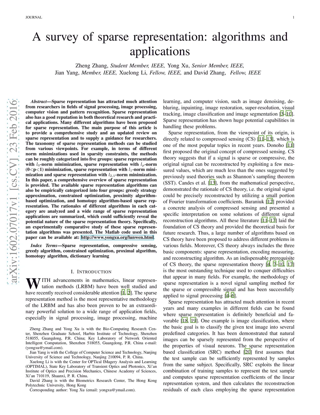 Sparse representation has attracted much attention from researchers in fields of signal processing, image processing, computer vision and pattern recognition. Sparse representation also has a good reputation in both theoretical research and practical applications. Many different algorithms have been proposed for sparse representation. The main purpose of this article is to provide a comprehensive study and an updated review on sparse representation and to supply a guidance for researchers. The taxonomy of sparse representation methods can be studied from various viewpoints. For example, in terms of different norm minimizations used in sparsity constraints, the methods can be roughly categorized into five groups: sparse representation with -norm minimization, sparse representation with -norm (0p1) minimization, sparse representation with -norm minimization and sparse representation with -norm minimization. In this paper, a comprehensive overview of sparse representation is provided. The available sparse representation algorithms can also be empirically categorized into four groups: greedy strategy approximation, constrained optimization, proximity algorithm-based optimization, and homotopy algorithm-based sparse representation. The rationales of different algorithms in each category are analyzed and a wide range of sparse representation applications are summarized, which could sufficiently reveal the potential nature of the sparse representation theory. Specifically, an experimentally comparative study of these sparse representation algorithms was presented. The Matlab code used in this paper can be available at: http://www.yongxu.org/lunwen.html.