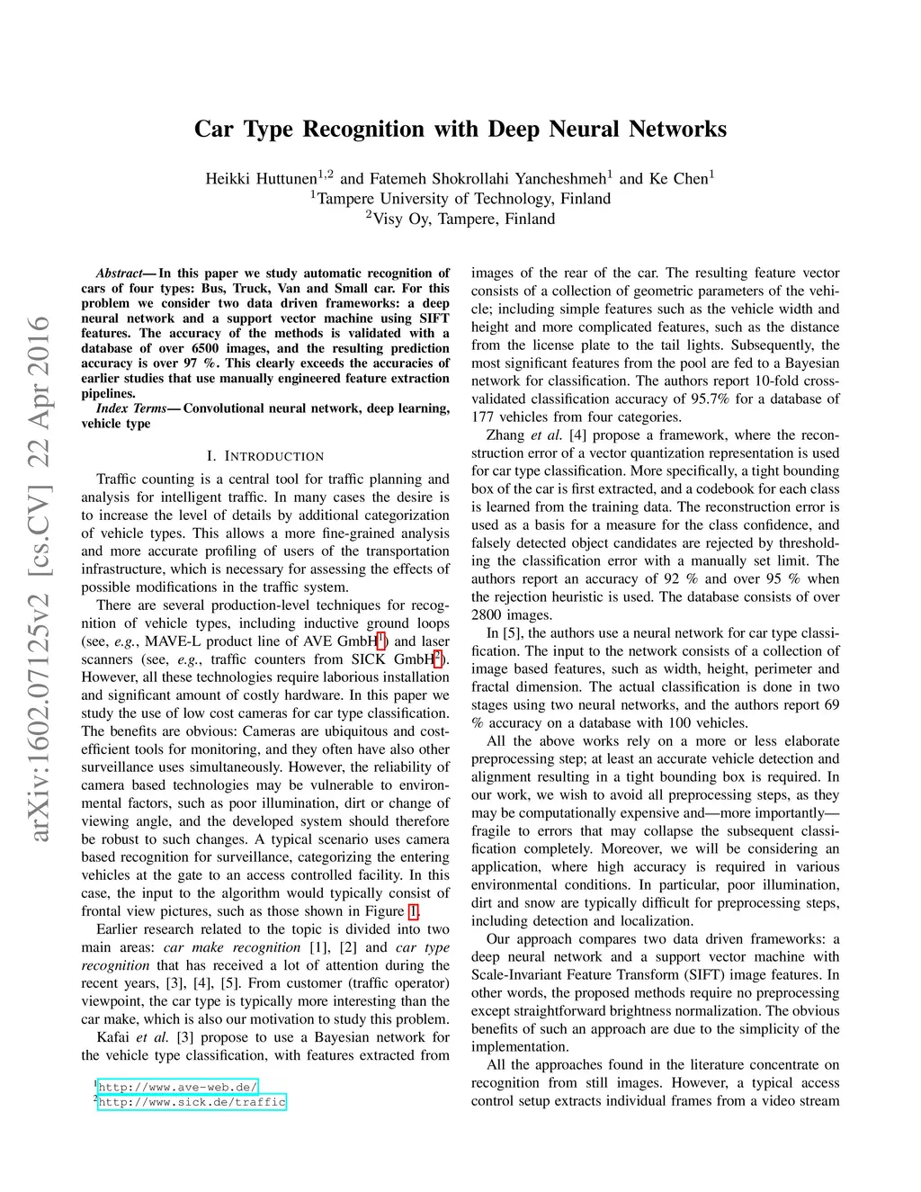 In this paper we study automatic recognition of cars of four types: Bus, Truck, Van and Small car. For this problem we consider two data driven frameworks: a deep neural network and a support vector machine using SIFT features. The accuracy of the methods is validated with a database of over 6500 images, and the resulting prediction accuracy is over 97 %. This clearly exceeds the accuracies of earlier studies that use manually engineered feature extraction pipelines.