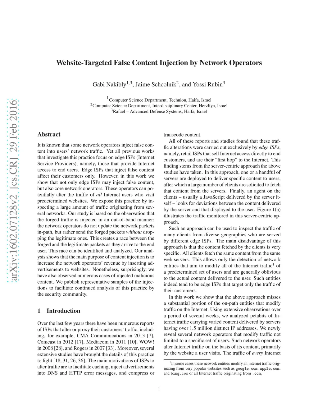 It is known that some network operators inject false content into users' network traffic. Yet all previous works that investigate this practice focus on edge ISPs (Internet Service Providers), namely, those that provide Internet access to end users. Edge ISPs that inject false content affect their customers only. However, in this work we show that not only edge ISPs may inject false content, but also core network operators. These operators can potentially alter the traffic of \emph{all} Internet users who visit predetermined websites. We expose this practice by inspecting a large amount of traffic originating from several networks. Our study is based on the observation that the forged traffic is injected in an out-of-band manner: the network operators do not update the network packets in-path, but rather send the forged packets \emph{without} dropping the legitimate ones. This creates a race between the forged and the legitimate packets as they arrive to the end user. This race can be identified and analyzed. Our analysis shows that the main purpose of content injection is to increase the network operators' revenue by inserting advertisements to websites. Nonetheless, surprisingly, we have also observed numerous cases of injected malicious content. We publish representative samples of the injections to facilitate continued analysis of this practice by the security community.