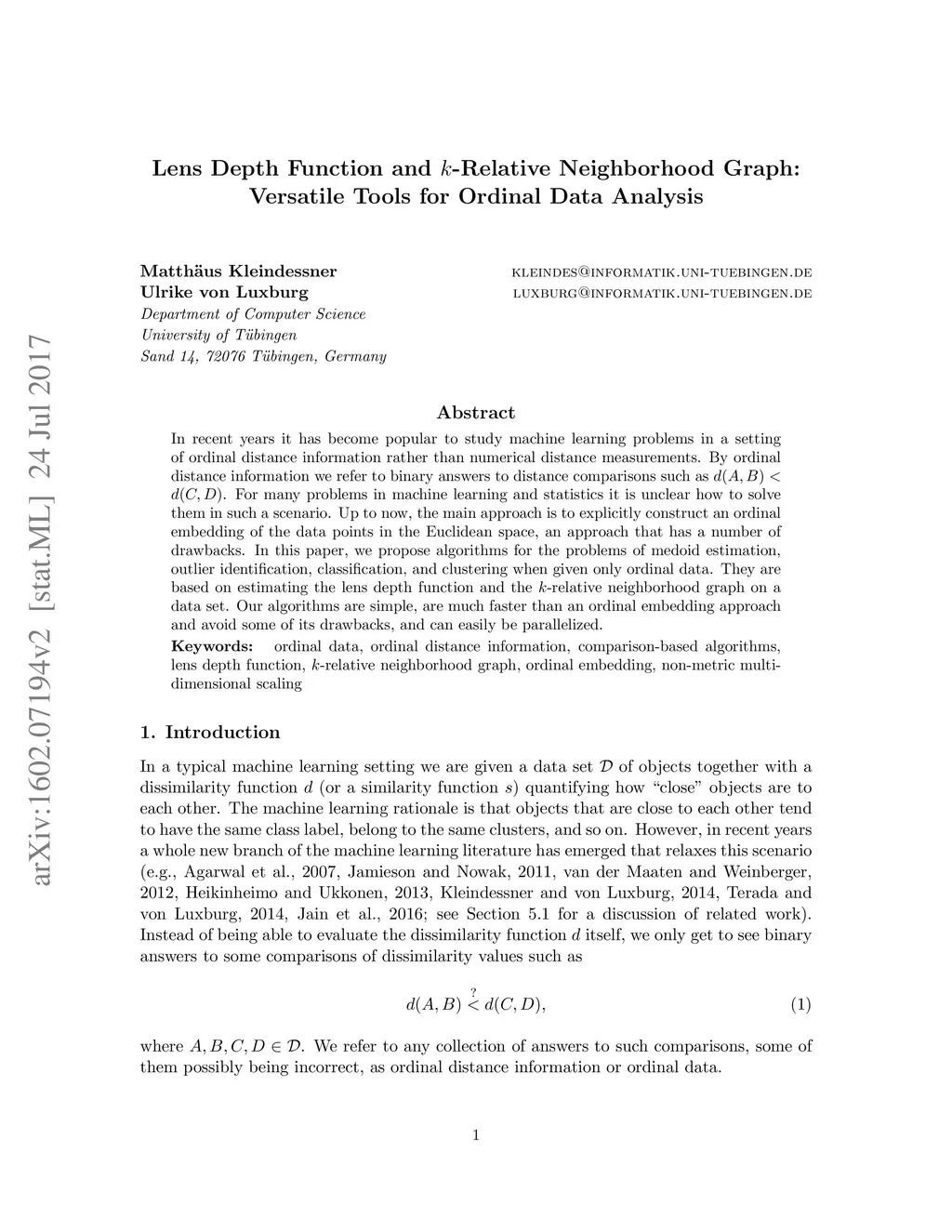 In recent years it has become popular to study machine learning problems in a setting of ordinal distance information rather than numerical distance measurements. By ordinal distance information we refer to binary answers to distance comparisons such as . For many problems in machine learning and statistics it is unclear how to solve them in such a scenario. Up to now, the main approach is to explicitly construct an ordinal embedding of the data points in the Euclidean space, an approach that has a number of drawbacks. In this paper, we propose algorithms for the problems of medoid estimation, outlier identification, classification, and clustering when given only ordinal data. They are based on estimating the lens depth function and the -relative neighborhood graph on a data set. Our algorithms are simple, are much faster than an ordinal embedding approach and avoid some of its drawbacks, and can easily be parallelized.