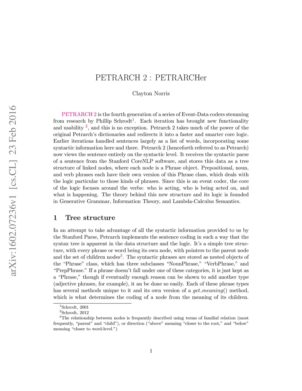 PETRARCH 2 is the fourth generation of a series of Event-Data coders stemming from research by Phillip Schrodt. Each iteration has brought new functionality and usability, and this is no exception.Petrarch 2 takes much of the power of the original Petrarch's dictionaries and redirects it into a faster and smarter core logic. Earlier iterations handled sentences largely as a list of words, incorporating some syntactic information here and there. Petrarch 2 now views the sentence entirely on the syntactic level. It receives the syntactic parse of a sentence from the Stanford CoreNLP software, and stores this data as a tree structure of linked nodes, where each node is a Phrase object. Prepositional, noun, and verb phrases each have their own version of this Phrase class, which deals with the logic particular to those kinds of phrases. Since this is an event coder, the core of the logic focuses around the verbs: who is acting, who is being acted on, and what is happening. The theory behind this new structure and its logic is founded in Generative Grammar, Information Theory, and Lambda-Calculus Semantics.