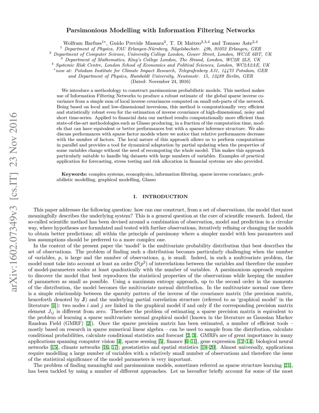 We introduce a methodology to construct parsimonious probabilistic models. This method makes use of Information Filtering Networks to produce a robust estimate of the global sparse inverse covariance from a simple sum of local inverse covariances computed on small sub-parts of the network. Being based on local and low-dimensional inversions, this method is computationally very efficient and statistically robust even for the estimation of inverse covariance of high-dimensional, noisy and short time-series. Applied to financial data our method results computationally more efficient than state-of-the-art methodologies such as Glasso producing, in a fraction of the computation time, models that can have equivalent or better performances but with a sparser inference structure. We also discuss performances with sparse factor models where we notice that relative performances decrease with the number of factors. The local nature of this approach allows us to perform computations in parallel and provides a tool for dynamical adaptation by partial updating when the properties of some variables change without the need of recomputing the whole model. This makes this approach particularly suitable to handle big datasets with large numbers of variables. Examples of practical application for forecasting, stress testing and risk allocation in financial systems are also provided.