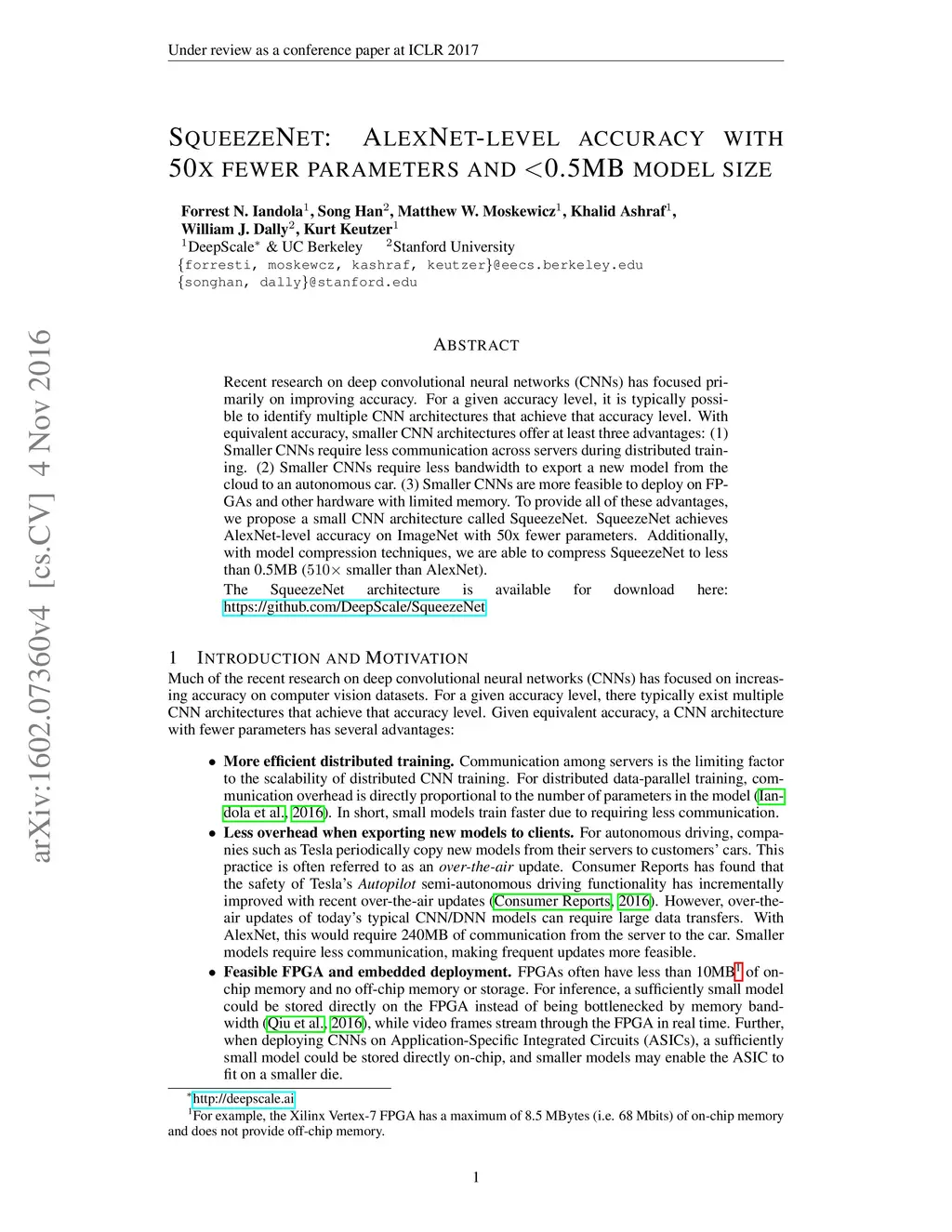 Recent research on deep neural networks has focused primarily on improving accuracy. For a given accuracy level, it is typically possible to identify multiple DNN architectures that achieve that accuracy level. With equivalent accuracy, smaller DNN architectures offer at least three advantages: (1) Smaller DNNs require less communication across servers during distributed training. (2) Smaller DNNs require less bandwidth to export a new model from the cloud to an autonomous car. (3) Smaller DNNs are more feasible to deploy on FPGAs and other hardware with limited memory. To provide all of these advantages, we propose a small DNN architecture called SqueezeNet. SqueezeNet achieves AlexNet-level accuracy on ImageNet with 50x fewer parameters. Additionally, with model compression techniques we are able to compress SqueezeNet to less than 0.5MB (510x smaller than AlexNet). The SqueezeNet architecture is available for download here: https://github.com/DeepScale/SqueezeNet