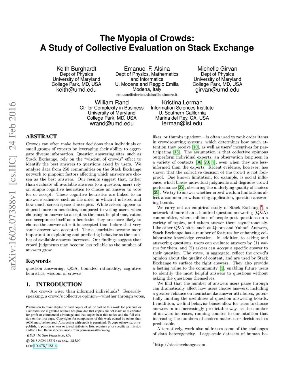 Crowds can often make better decisions than individuals or small groups of experts by leveraging their ability to aggregate diverse information. Question answering sites, such as Stack Exchange, rely on the "wisdom of crowds" effect to identify the best answers to questions asked by users. We analyze data from 250 communities on the Stack Exchange network to pinpoint factors affecting which answers are chosen as the best answers. Our results suggest that, rather than evaluate all available answers to a question, users rely on simple cognitive heuristics to choose an answer to vote for or accept. These cognitive heuristics are linked to an answer's salience, such as the order in which it is listed and how much screen space it occupies. While askers appear to depend more on heuristics, compared to voting users, when choosing an answer to accept as the most helpful one, voters use acceptance itself as a heuristic: they are more likely to choose the answer after it is accepted than before that very same answer was accepted. These heuristics become more important in explaining and predicting behavior as the number of available answers increases. Our findings suggest that crowd judgments may become less reliable as the number of answers grow.