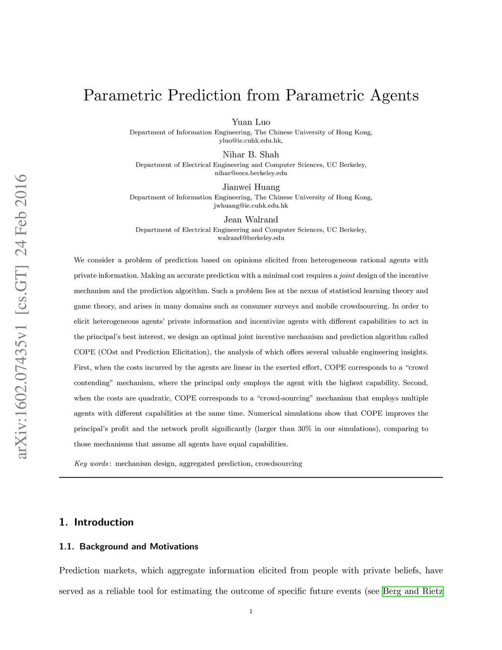 We consider a problem of prediction based on opinions elicited from heterogeneous rational agents with private information. Making an accurate prediction with a minimal cost requires a joint design of the incentive mechanism and the prediction algorithm. Such a problem lies at the nexus of statistical learning theory and game theory, and arises in many domains such as consumer surveys and mobile crowdsourcing. In order to elicit heterogeneous agents' private information and incentivize agents with different capabilities to act in the principal's best interest, we design an optimal joint incentive mechanism and prediction algorithm called COPE (COst and Prediction Elicitation), the analysis of which offers several valuable engineering insights. First, when the costs incurred by the agents are linear in the exerted effort, COPE corresponds to a "crowd contending" mechanism, where the principal only employs the agent with the highest capability. Second, when the costs are quadratic, COPE corresponds to a "crowd-sourcing" mechanism that employs multiple agents with different capabilities at the same time. Numerical simulations show that COPE improves the principal's profit and the network profit significantly (larger than 30% in our simulations), comparing to those mechanisms that assume all agents have equal capabilities.