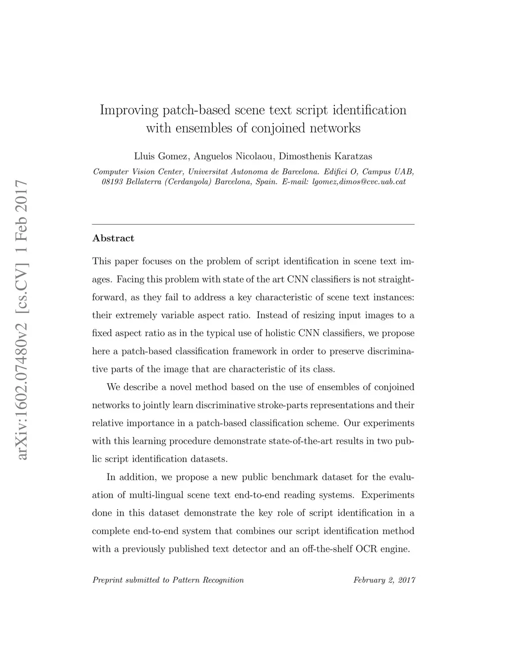 This paper focuses on the problem of script identification in scene text images. Facing this problem with state of the art CNN classifiers is not straightforward, as they fail to address a key characteristic of scene text instances: their extremely variable aspect ratio. Instead of resizing input images to a fixed aspect ratio as in the typical use of holistic CNN classifiers, we propose here a patch-based classification framework in order to preserve discriminative parts of the image that are characteristic of its class. We describe a novel method based on the use of ensembles of conjoined networks to jointly learn discriminative stroke-parts representations and their relative importance in a patch-based classification scheme. Our experiments with this learning procedure demonstrate state-of-the-art results in two public script identification datasets. In addition, we propose a new public benchmark dataset for the evaluation of multi-lingual scene text end-to-end reading systems. Experiments done in this dataset demonstrate the key role of script identification in a complete end-to-end system that combines our script identification method with a previously published text detector and an off-the-shelf OCR engine.