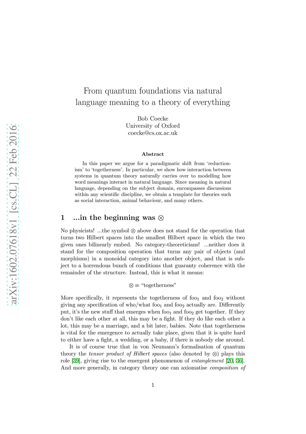 In this paper we argue for a paradigmatic shift from `reductionism' to `togetherness'. In particular, we show how interaction between systems in quantum theory naturally carries over to modelling how word meanings interact in natural language. Since meaning in natural language, depending on the subject domain, encompasses discussions within any scientific discipline, we obtain a template for theories such as social interaction, animal behaviour, and many others.