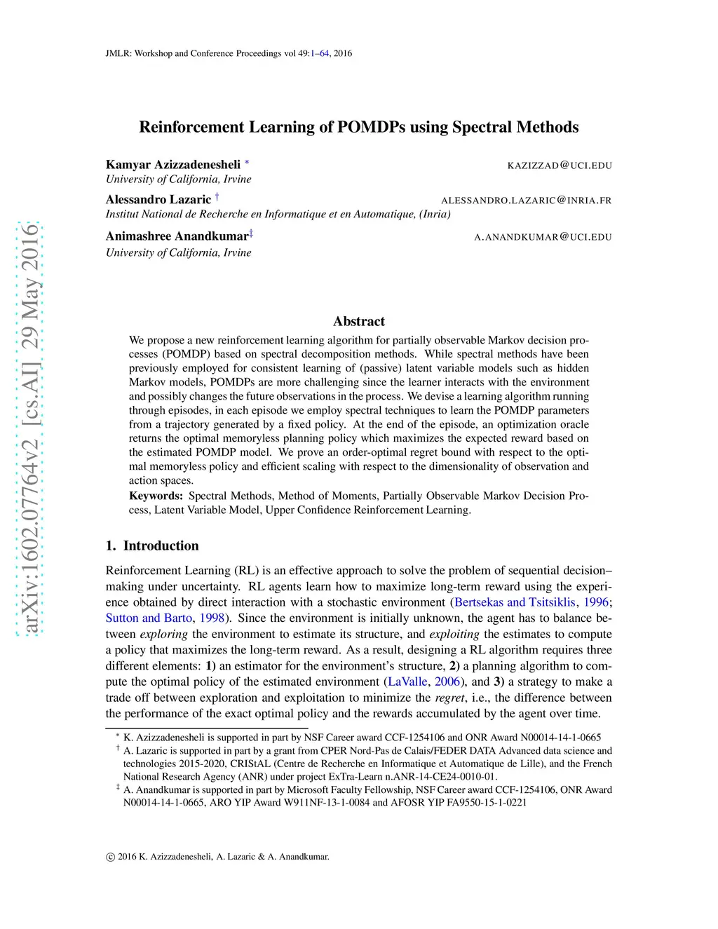 We propose a new reinforcement learning algorithm for partially observable Markov decision processes (POMDP) based on spectral decomposition methods. While spectral methods have been previously employed for consistent learning of (passive) latent variable models such as hidden Markov models, POMDPs are more challenging since the learner interacts with the environment and possibly changes the future observations in the process. We devise a learning algorithm running through episodes, in each episode we employ spectral techniques to learn the POMDP parameters from a trajectory generated by a fixed policy. At the end of the episode, an optimization oracle returns the optimal memoryless planning policy which maximizes the expected reward based on the estimated POMDP model. We prove an order-optimal regret bound with respect to the optimal memoryless policy and efficient scaling with respect to the dimensionality of observation and action spaces.