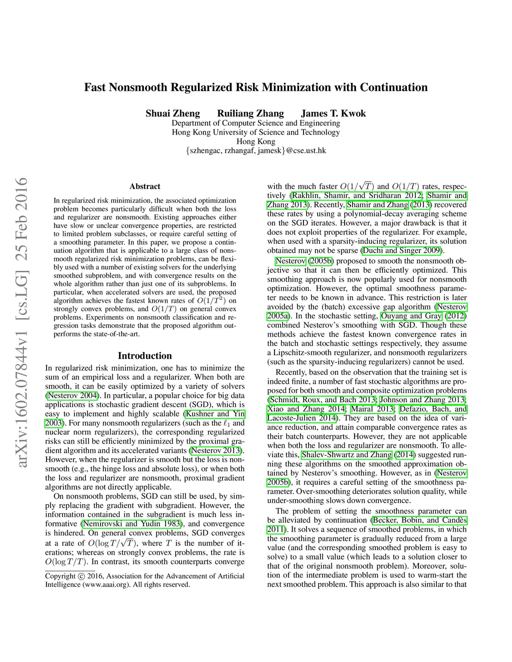 In regularized risk minimization, the associated optimization problem becomes particularly difficult when both the loss and regularizer are nonsmooth. Existing approaches either have slow or unclear convergence properties, are restricted to limited problem subclasses, or require careful setting of a smoothing parameter. In this paper, we propose a continuation algorithm that is applicable to a large class of nonsmooth regularized risk minimization problems, can be flexibly used with a number of existing solvers for the underlying smoothed subproblem, and with convergence results on the whole algorithm rather than just one of its subproblems. In particular, when accelerated solvers are used, the proposed algorithm achieves the fastest known rates of on strongly convex problems, and on general convex problems. Experiments on nonsmooth classification and regression tasks demonstrate that the proposed algorithm outperforms the state-of-the-art.