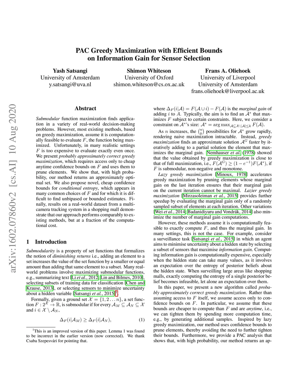 Submodular function maximization finds application in a variety of real-world decision-making problems. However, most existing methods, based on greedy maximization, assume it is computationally feasible to evaluate F, the function being maximized. Unfortunately, in many realistic settings F is too expensive to evaluate exactly even once. We present probably approximately correct greedy maximization, which requires access only to cheap anytime confidence bounds on F and uses them to prune elements. We show that, with high probability, our method returns an approximately optimal set. We propose novel, cheap confidence bounds for conditional entropy, which appears in many common choices of F and for which it is difficult to find unbiased or bounded estimates. Finally, results on a real-world dataset from a multi-camera tracking system in a shopping mall demonstrate that our approach performs comparably to existing methods, but at a fraction of the computational cost.