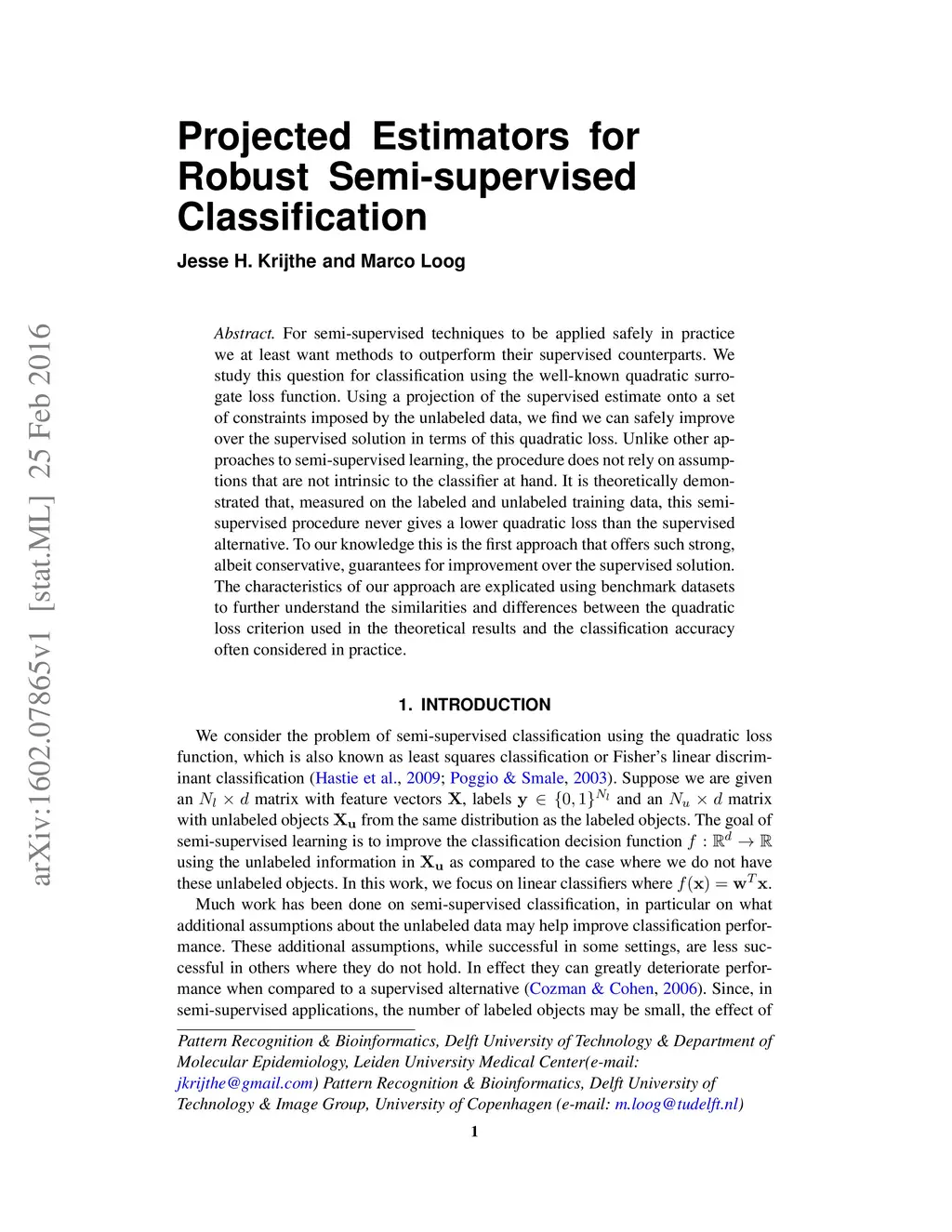 For semi-supervised techniques to be applied safely in practice we at least want methods to outperform their supervised counterparts. We study this question for classification using the well-known quadratic surrogate loss function. Using a projection of the supervised estimate onto a set of constraints imposed by the unlabeled data, we find we can safely improve over the supervised solution in terms of this quadratic loss. Unlike other approaches to semi-supervised learning, the procedure does not rely on assumptions that are not intrinsic to the classifier at hand. It is theoretically demonstrated that, measured on the labeled and unlabeled training data, this semi-supervised procedure never gives a lower quadratic loss than the supervised alternative. To our knowledge this is the first approach that offers such strong, albeit conservative, guarantees for improvement over the supervised solution. The characteristics of our approach are explicated using benchmark datasets to further understand the similarities and differences between the quadratic loss criterion used in the theoretical results and the classification accuracy often considered in practice.