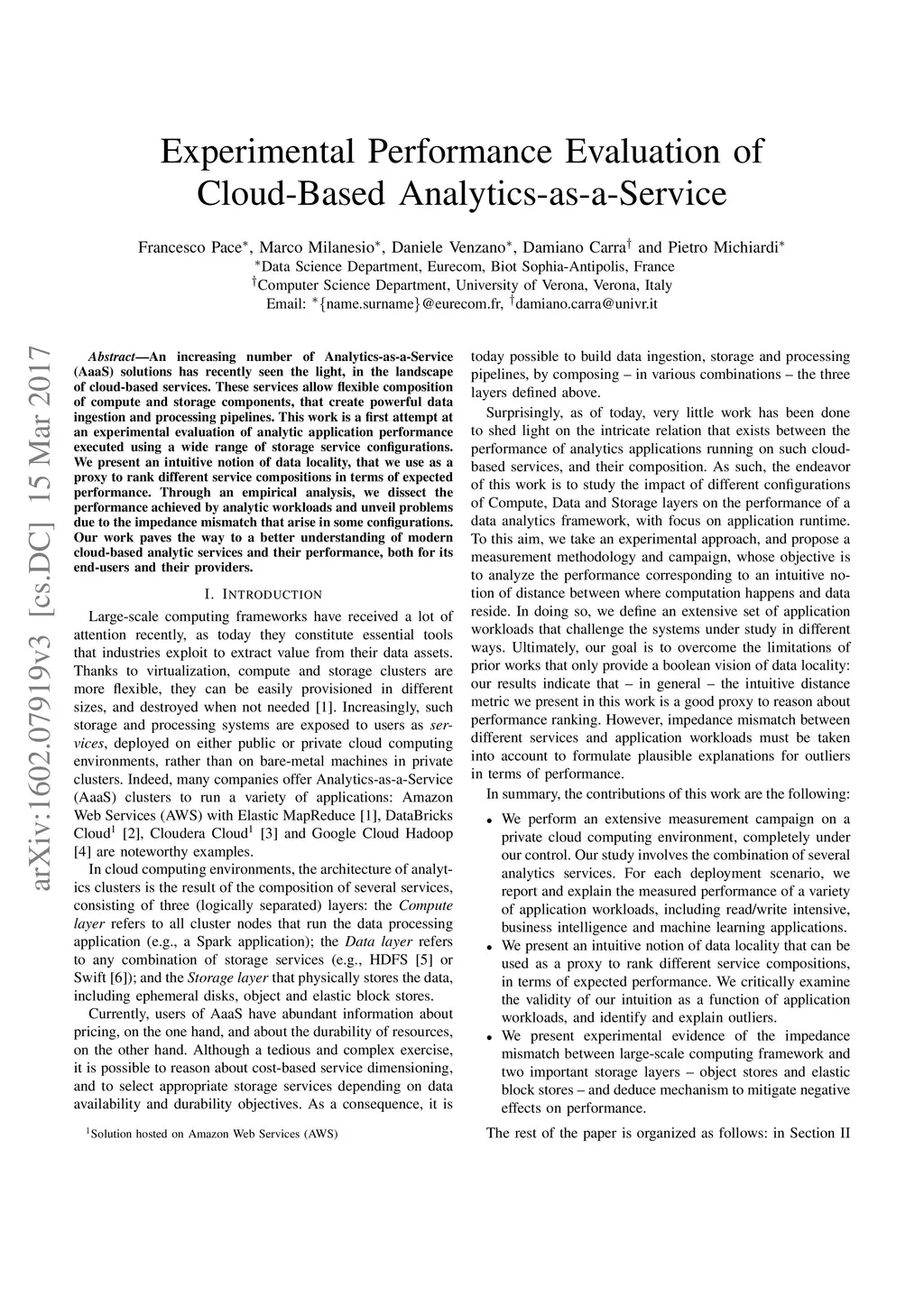 An increasing number of Analytics-as-a-Service solutions has recently seen the light, in the landscape of cloud-based services. These services allow flexible composition of compute and storage components, that create powerful data ingestion and processing pipelines. This work is a first attempt at an experimental evaluation of analytic application performance executed using a wide range of storage service configurations. We present an intuitive notion of data locality, that we use as a proxy to rank different service compositions in terms of expected performance. Through an empirical analysis, we dissect the performance achieved by analytic workloads and unveil problems due to the impedance mismatch that arise in some configurations. Our work paves the way to a better understanding of modern cloud-based analytic services and their performance, both for its end-users and their providers.
