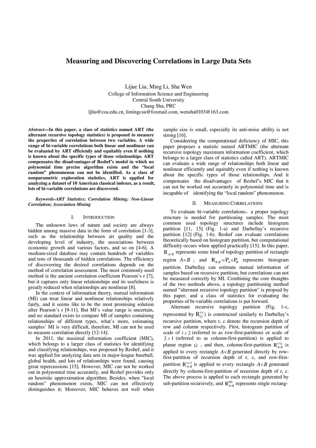 In this paper, a class of statistics named ART (the alternant recursive topology statistics) is proposed to measure the properties of correlation between two variables. A wide range of bi-variable correlations both linear and nonlinear can be evaluated by ART efficiently and equitably even if nothing is known about the specific types of those relationships. ART compensates the disadvantages of Reshef's model in which no polynomial time precise algorithm exists and the "local random" phenomenon can not be identified. As a class of nonparametric exploration statistics, ART is applied for analyzing a dataset of 10 American classical indexes, as a result, lots of bi-variable correlations are discovered.