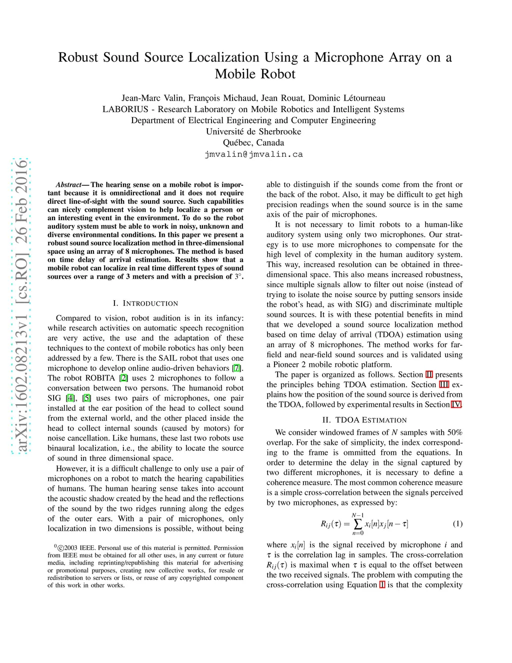 The hearing sense on a mobile robot is important because it is omnidirectional and it does not require direct line-of-sight with the sound source. Such capabilities can nicely complement vision to help localize a person or an interesting event in the environment. To do so the robot auditory system must be able to work in noisy, unknown and diverse environmental conditions. In this paper we present a robust sound source localization method in three-dimensional space using an array of 8 microphones. The method is based on time delay of arrival estimation. Results show that a mobile robot can localize in real time different types of sound sources over a range of 3 meters and with a precision of 3 degrees.