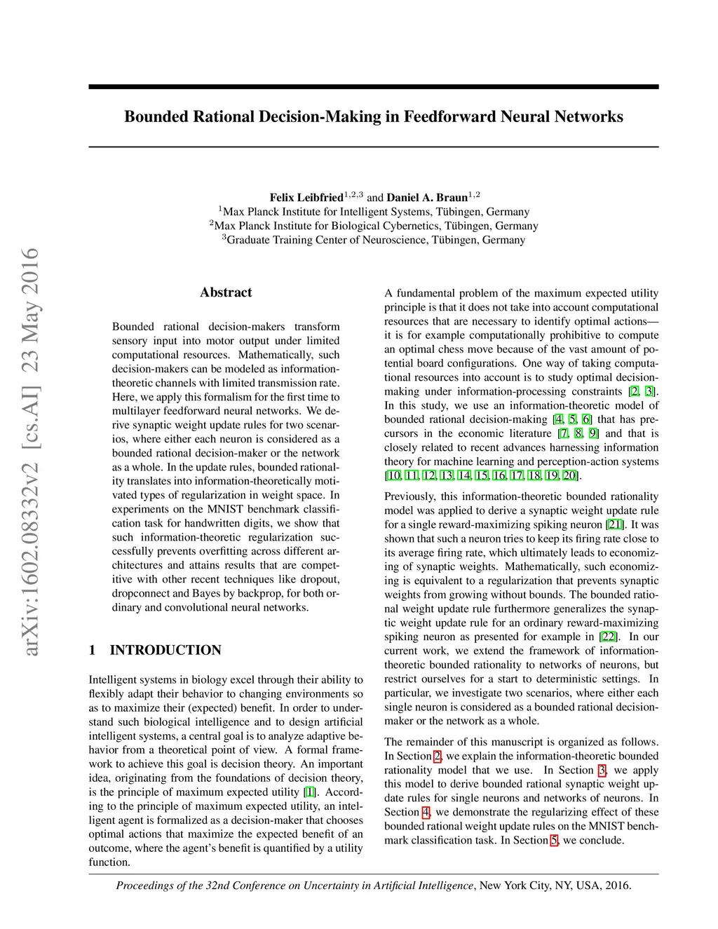 Bounded rational decision-makers transform sensory input into motor output under limited computational resources. Mathematically, such decision-makers can be modeled as information-theoretic channels with limited transmission rate. Here, we apply this formalism for the first time to multilayer feedforward neural networks. We derive synaptic weight update rules for two scenarios, where either each neuron is considered as a bounded rational decision-maker or the network as a whole. In the update rules, bounded rationality translates into information-theoretically motivated types of regularization in weight space. In experiments on the MNIST benchmark classification task for handwritten digits, we show that such information-theoretic regularization successfully prevents overfitting across different architectures and attains state-of-the-art results for both ordinary and convolutional neural networks.