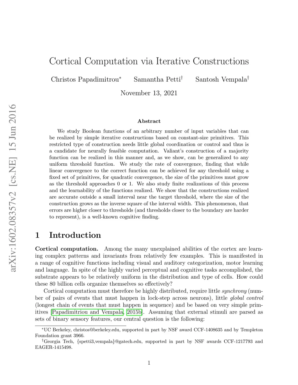 We study Boolean functions of an arbitrary number of input variables that can be realized by simple iterative constructions based on constant-size primitives. This restricted type of construction needs little global coordination or control and thus is a candidate for neurally feasible computation. Valiant's construction of a majority function can be realized in this manner and, as we show, can be generalized to any uniform threshold function. We study the rate of convergence, finding that while linear convergence to the correct function can be achieved for any threshold using a fixed set of primitives, for quadratic convergence, the size of the primitives must grow as the threshold approaches 0 or 1. We also study finite realizations of this process and the learnability of the functions realized. We show that the constructions realized are accurate outside a small interval near the target threshold, where the size of the construction grows as the inverse square of the interval width. This phenomenon, that errors are higher closer to thresholds (and thresholds closer to the boundary are harder to represent), is a well-known cognitive finding.