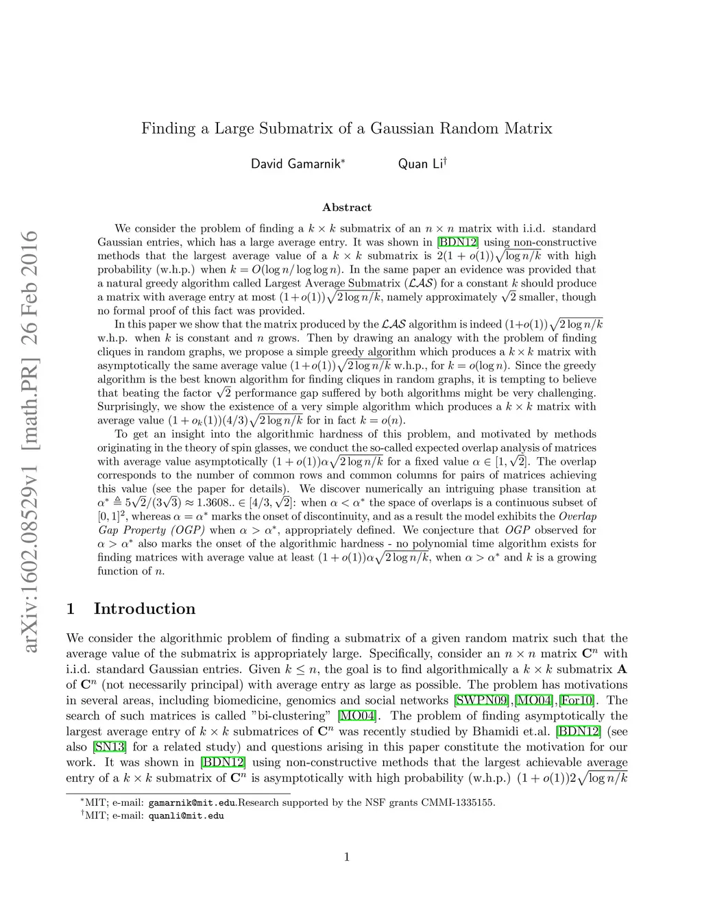 We consider the problem of finding a submatrix of an matrix with i.i.d. standard Gaussian entries, which has a large average entry. It was shown earlier by Bhamidi et al. that the largest average value of such a matrix is with high probability. In the same paper an evidence was provided that a natural greedy algorithm called Largest Average Submatrix () should produce a matrix with average entry approximately smaller. In this paper we show that the matrix produced by the algorithm is indeed w.h.p. Then by drawing an analogy with the problem of finding cliques in random graphs, we propose a simple greedy algorithm which produces a matrix with asymptotically the same average value. Since the greedy algorithm is the best known algorithm for finding cliques in random graphs, it is tempting to believe that beating the factor performance gap suffered by both algorithms might be very challenging. Surprisingly, we show the existence of a very simple algorithm which produces a matrix with average value . To get an insight into the algorithmic hardness of this problem, and motivated by methods originating in the theory of spin glasses, we conduct the so-called expected overlap analysis of matrices with average value asymptotically . The overlap corresponds to the number of common rows and common columns for pairs of matrices achieving this value. We discover numerically an intriguing phase transition at : when the space of overlaps is a continuous subset of , whereas marks the onset of discontinuity, and the model exhibits the Overlap Gap Property when . We conjecture that marks the onset of the algorithmic hardness.