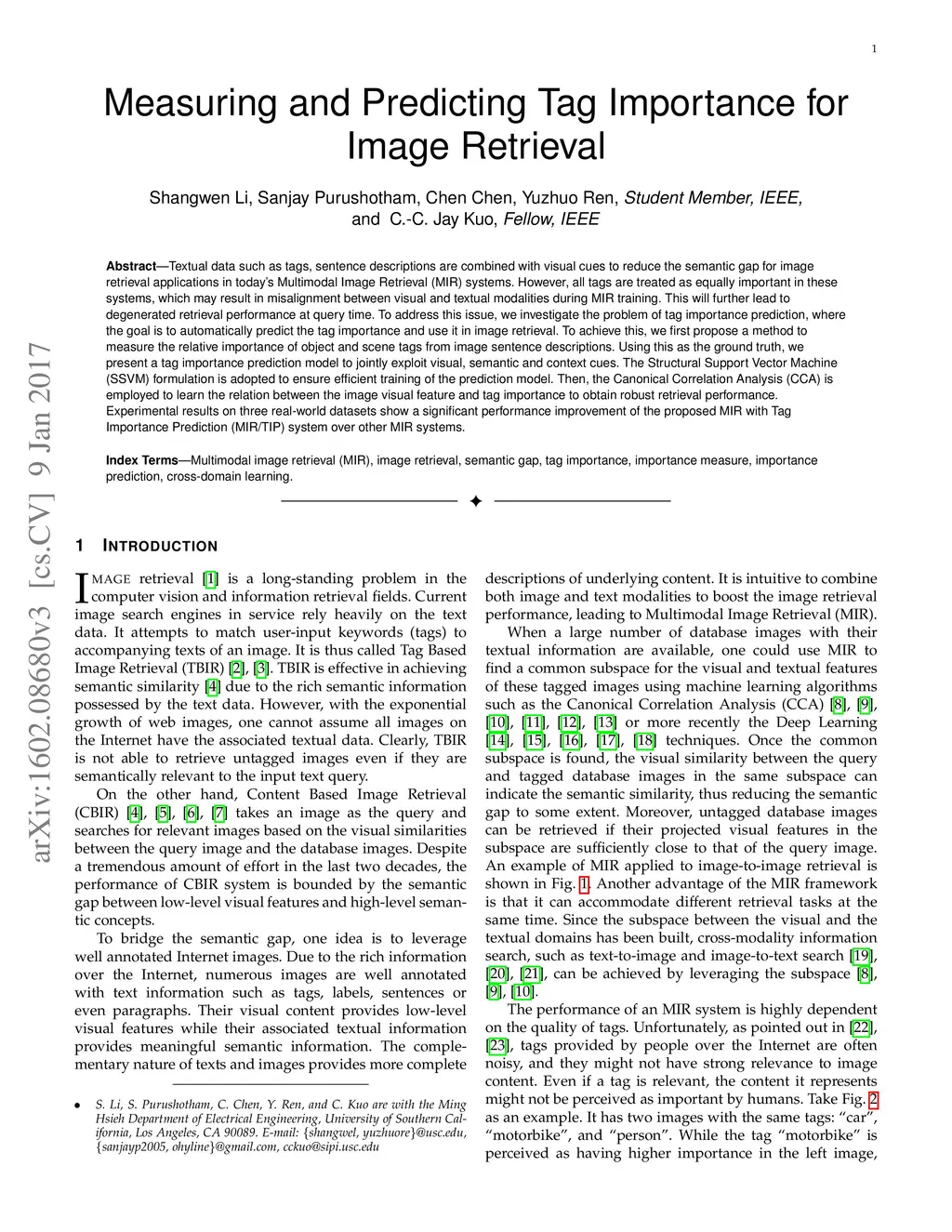 Textual data such as tags, sentence descriptions are combined with visual cues to reduce the semantic gap for image retrieval applications in today's Multimodal Image Retrieval (MIR) systems. However, all tags are treated as equally important in these systems, which may result in misalignment between visual and textual modalities during MIR training. This will further lead to degenerated retrieval performance at query time. To address this issue, we investigate the problem of tag importance prediction, where the goal is to automatically predict the tag importance and use it in image retrieval. To achieve this, we first propose a method to measure the relative importance of object and scene tags from image sentence descriptions. Using this as the ground truth, we present a tag importance prediction model to jointly exploit visual, semantic and context cues. The Structural Support Vector Machine (SSVM) formulation is adopted to ensure efficient training of the prediction model. Then, the Canonical Correlation Analysis (CCA) is employed to learn the relation between the image visual feature and tag importance to obtain robust retrieval performance. Experimental results on three real-world datasets show a significant performance improvement of the proposed MIR with Tag Importance Prediction (MIR/TIP) system over other MIR systems.