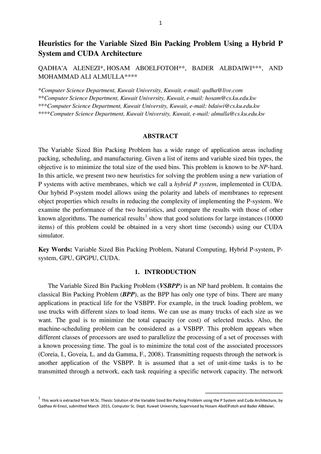 The Variable Sized Bin Packing Problem has a wide range of application areas including packing, scheduling, and manufacturing. Given a list of items and variable sized bin types, the objective is to minimize the total size of the used bins. This problem is known to be NP-hard. In this article, we present two new heuristics for solving the problem using a new variation of P systems with active membranes, which we call a hybrid P system, implemented in CUDA. Our hybrid P-system model allows using the polarity and labels of membranes to represent object properties which results in reducing the complexity of implementing the P-system. We examine the performance of the two heuristics, and compare the results with those of other known algorithms. The numerical results show that good solutions for large instances (10000 items) of this problem could be obtained in a very short time (seconds) using our CUDA simulator.