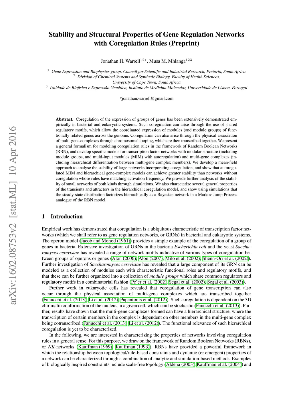 Coregulation of the expression of groups of genes has been extensively demonstrated empirically in bacterial and eukaryotic systems. Such coregulation can arise through the use of shared regulatory motifs, which allow the coordinated expression of modules (and module groups) of functionally related genes across the genome. Coregulation can also arise through the physical association of multi-gene complexes through chromosomal looping, which are then transcribed together. We present a general formalism for modeling coregulation rules in the framework of Random Boolean Networks (RBN), and develop specific models for transcription factor networks with modular structure (including module groups, and multi-input modules (MIM) with autoregulation) and multi-gene complexes (including hierarchical differentiation between multi-gene complex members). We develop a mean-field approach to analyse the stability of large networks incorporating coregulation, and show that autoregulated MIM and hierarchical gene-complex models can achieve greater stability than networks without coregulation whose rules have matching activation frequency. We provide further analysis of the stability of small networks of both kinds through simulations. We also characterize several general properties of the transients and attractors in the hierarchical coregulation model, and show using simulations that the steady-state distribution factorizes hierarchically as a Bayesian network in a Markov Jump Process analogue of the RBN model.