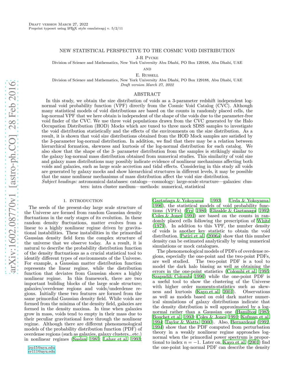 In this study, we obtain the size distribution of voids as a 3-parameter redshift independent log-normal void probability function (VPF) directly from the Cosmic Void Catalog (CVC). Although many statistical models of void distributions are based on the counts in randomly placed cells, the log-normal VPF that we here obtain is independent of the shape of the voids due to the parameter-free void finder of the CVC. We use three void populations drawn from the CVC generated by the Halo Occupation Distribution (HOD) Mocks which are tuned to three mock SDSS samples to investigate the void distribution statistically and the effects of the environments on the size distribution. As a result, it is shown that void size distributions obtained from the HOD Mock samples are satisfied by the 3-parameter log-normal distribution. In addition, we find that there may be a relation between hierarchical formation, skewness and kurtosis of the log-normal distribution for each catalog. We also show that the shape of the 3-parameter distribution from the samples is strikingly similar to the galaxy log-normal mass distribution obtained from numerical studies. This similarity of void size and galaxy mass distributions may possibly indicate evidence of nonlinear mechanisms affecting both voids and galaxies, such as large scale accretion and tidal effects. Considering in this study all voids are generated by galaxy mocks and show hierarchical structures in different levels, it may be possible that the same nonlinear mechanisms of mass distribution affect the void size distribution.