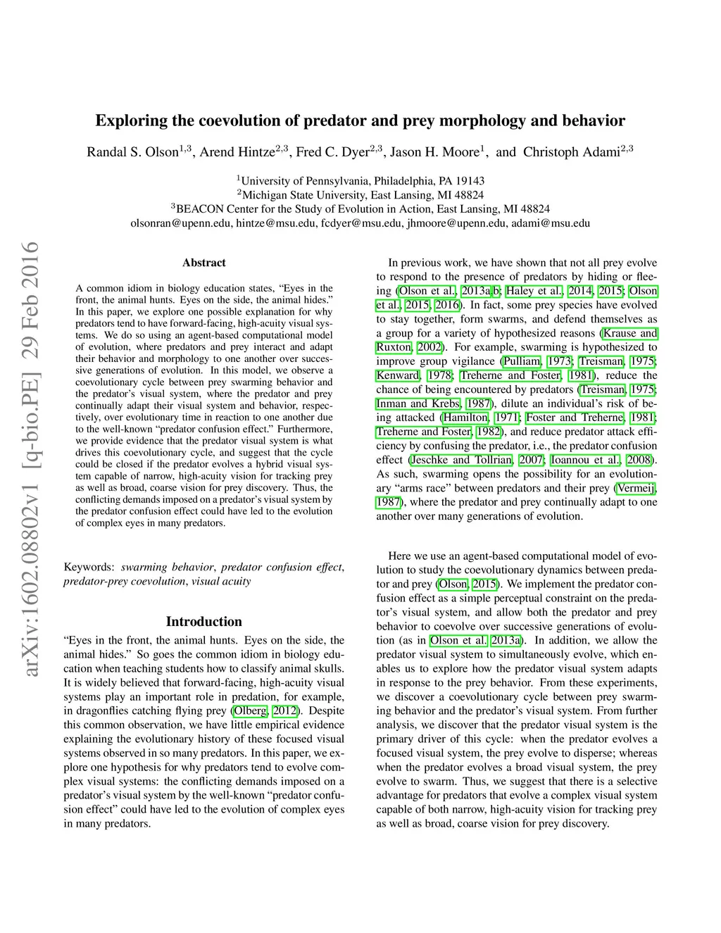 A common idiom in biology education states, "Eyes in the front, the animal hunts. Eyes on the side, the animal hides." In this paper, we explore one possible explanation for why predators tend to have forward-facing, high-acuity visual systems. We do so using an agent-based computational model of evolution, where predators and prey interact and adapt their behavior and morphology to one another over successive generations of evolution. In this model, we observe a coevolutionary cycle between prey swarming behavior and the predator's visual system, where the predator and prey continually adapt their visual system and behavior, respectively, over evolutionary time in reaction to one another due to the well-known "predator confusion effect." Furthermore, we provide evidence that the predator visual system is what drives this coevolutionary cycle, and suggest that the cycle could be closed if the predator evolves a hybrid visual system capable of narrow, high-acuity vision for tracking prey as well as broad, coarse vision for prey discovery. Thus, the conflicting demands imposed on a predator's visual system by the predator confusion effect could have led to the evolution of complex eyes in many predators.