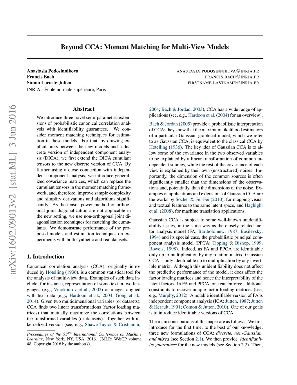 We introduce three novel semi-parametric extensions of probabilistic canonical correlation analysis with identifiability guarantees. We consider moment matching techniques for estimation in these models. For that, by drawing explicit links between the new models and a discrete version of independent component analysis (DICA), we first extend the DICA cumulant tensors to the new discrete version of CCA. By further using a close connection with independent component analysis, we introduce generalized covariance matrices, which can replace the cumulant tensors in the moment matching framework, and, therefore, improve sample complexity and simplify derivations and algorithms significantly. As the tensor power method or orthogonal joint diagonalization are not applicable in the new setting, we use non-orthogonal joint diagonalization techniques for matching the cumulants. We demonstrate performance of the proposed models and estimation techniques on experiments with both synthetic and real datasets.