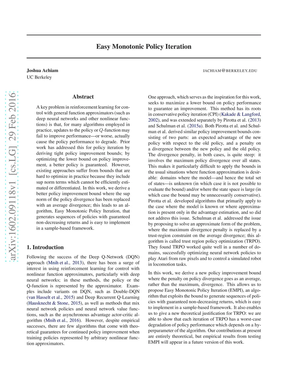 A key problem in reinforcement learning for control with general function approximators (such as deep neural networks and other nonlinear functions) is that, for many algorithms employed in practice, updates to the policy or -function may fail to improve performance---or worse, actually cause the policy performance to degrade. Prior work has addressed this for policy iteration by deriving tight policy improvement bounds; by optimizing the lower bound on policy improvement, a better policy is guaranteed. However, existing approaches suffer from bounds that are hard to optimize in practice because they include sup norm terms which cannot be efficiently estimated or differentiated. In this work, we derive a better policy improvement bound where the sup norm of the policy divergence has been replaced with an average divergence; this leads to an algorithm, Easy Monotonic Policy Iteration, that generates sequences of policies with guaranteed non-decreasing returns and is easy to implement in a sample-based framework.