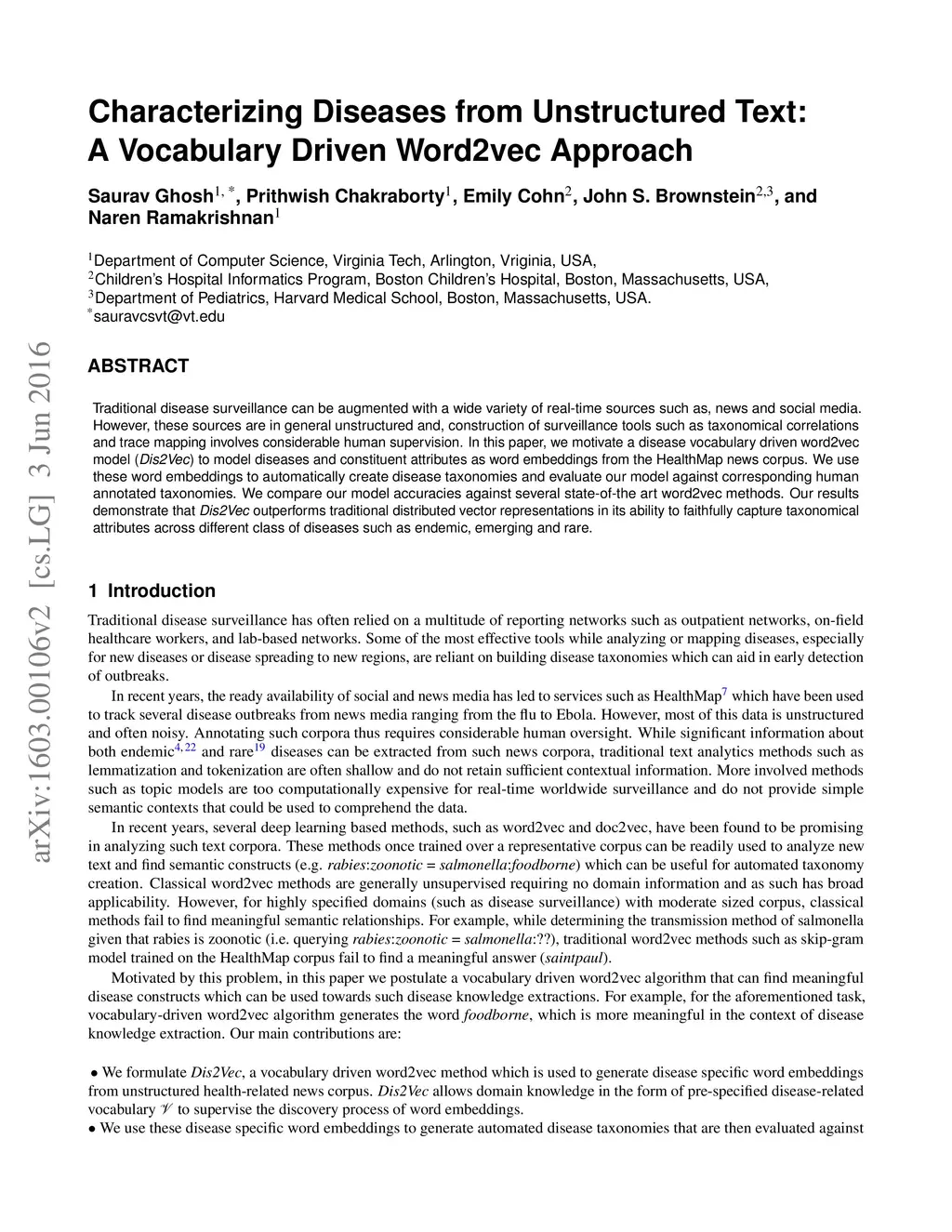 Traditional disease surveillance can be augmented with a wide variety of real-time sources such as, news and social media. However, these sources are in general unstructured and, construction of surveillance tools such as taxonomical correlations and trace mapping involves considerable human supervision. In this paper, we motivate a disease vocabulary driven word2vec model (Dis2Vec) to model diseases and constituent attributes as word embeddings from the HealthMap news corpus. We use these word embeddings to automatically create disease taxonomies and evaluate our model against corresponding human annotated taxonomies. We compare our model accuracies against several state-of-the art word2vec methods. Our results demonstrate that Dis2Vec outperforms traditional distributed vector representations in its ability to faithfully capture taxonomical attributes across different class of diseases such as endemic, emerging and rare.