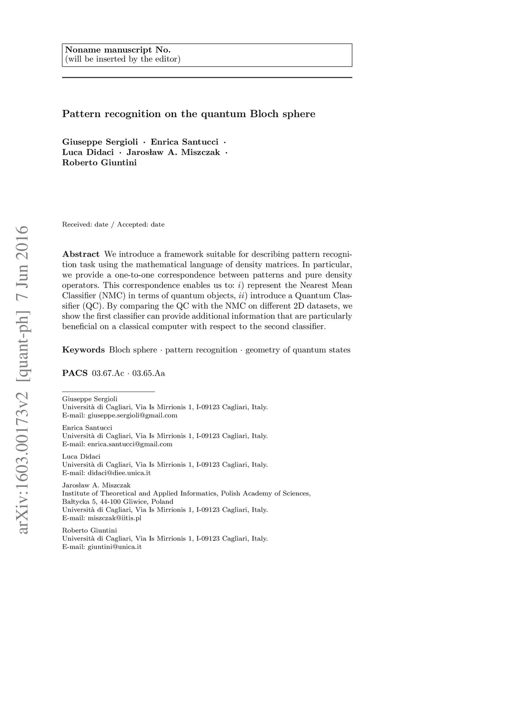 We introduce a framework suitable for describing pattern recognition task using the mathematical language of density matrices. In particular, we provide a one-to-one correspondence between patterns and pure density operators. This correspondence enables us to: i) represent the Nearest Mean Classifier (NMC) in terms of quantum objects, ii) introduce a Quantum Classifier (QC). By comparing the QC with the NMC on different 2D datasets, we show the first classifier can provide additional information that are particularly beneficial on a classical computer with respect to the second classifier.