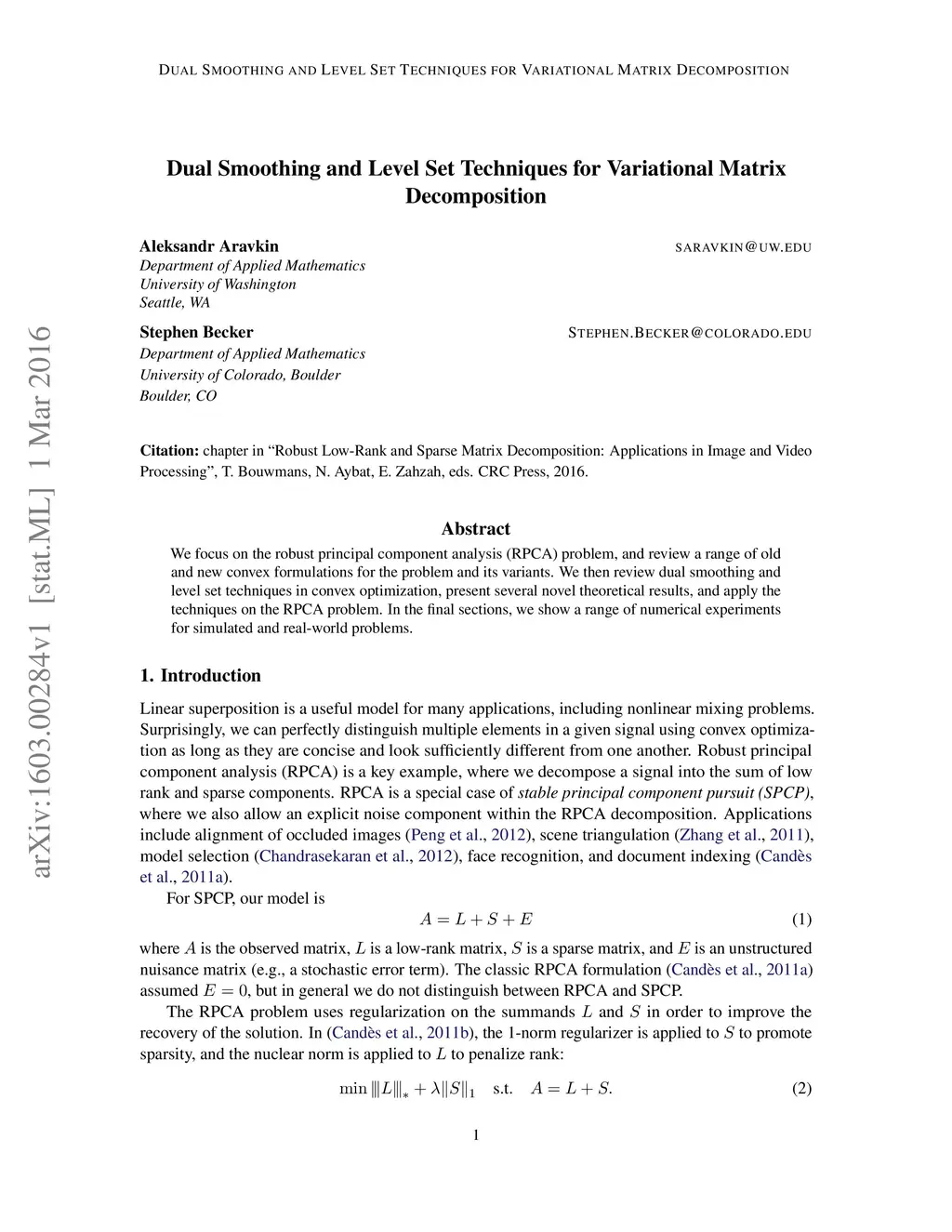 We focus on the robust principal component analysis (RPCA) problem, and review a range of old and new convex formulations for the problem and its variants. We then review dual smoothing and level set techniques in convex optimization, present several novel theoretical results, and apply the techniques on the RPCA problem. In the final sections, we show a range of numerical experiments for simulated and real-world problems.