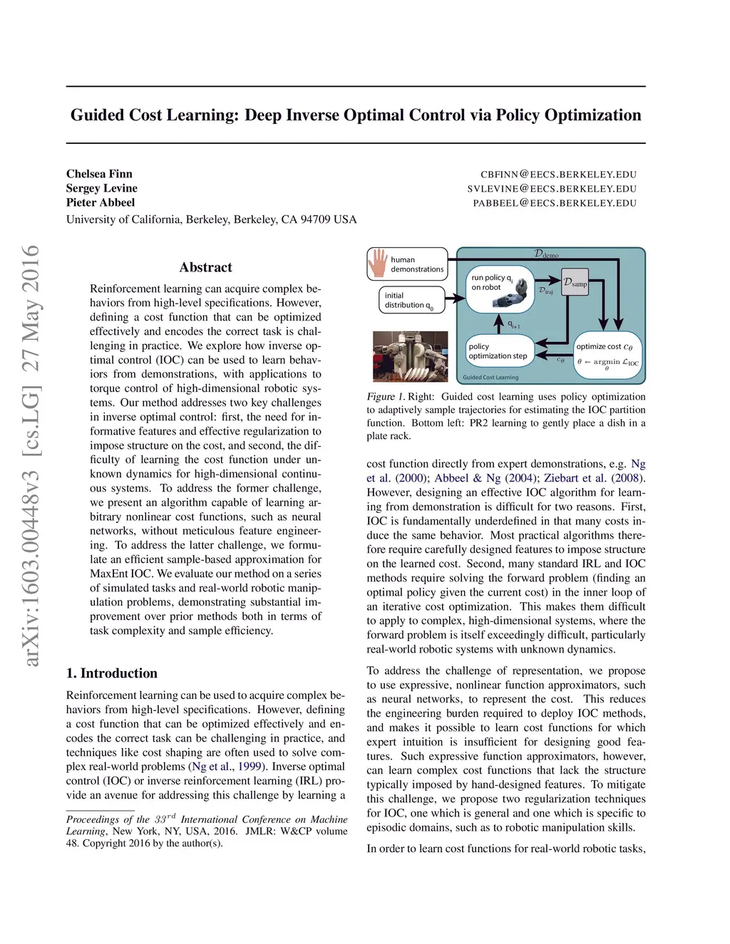 Guided Cost Learning: Deep Inverse Optimal Control via Policy
