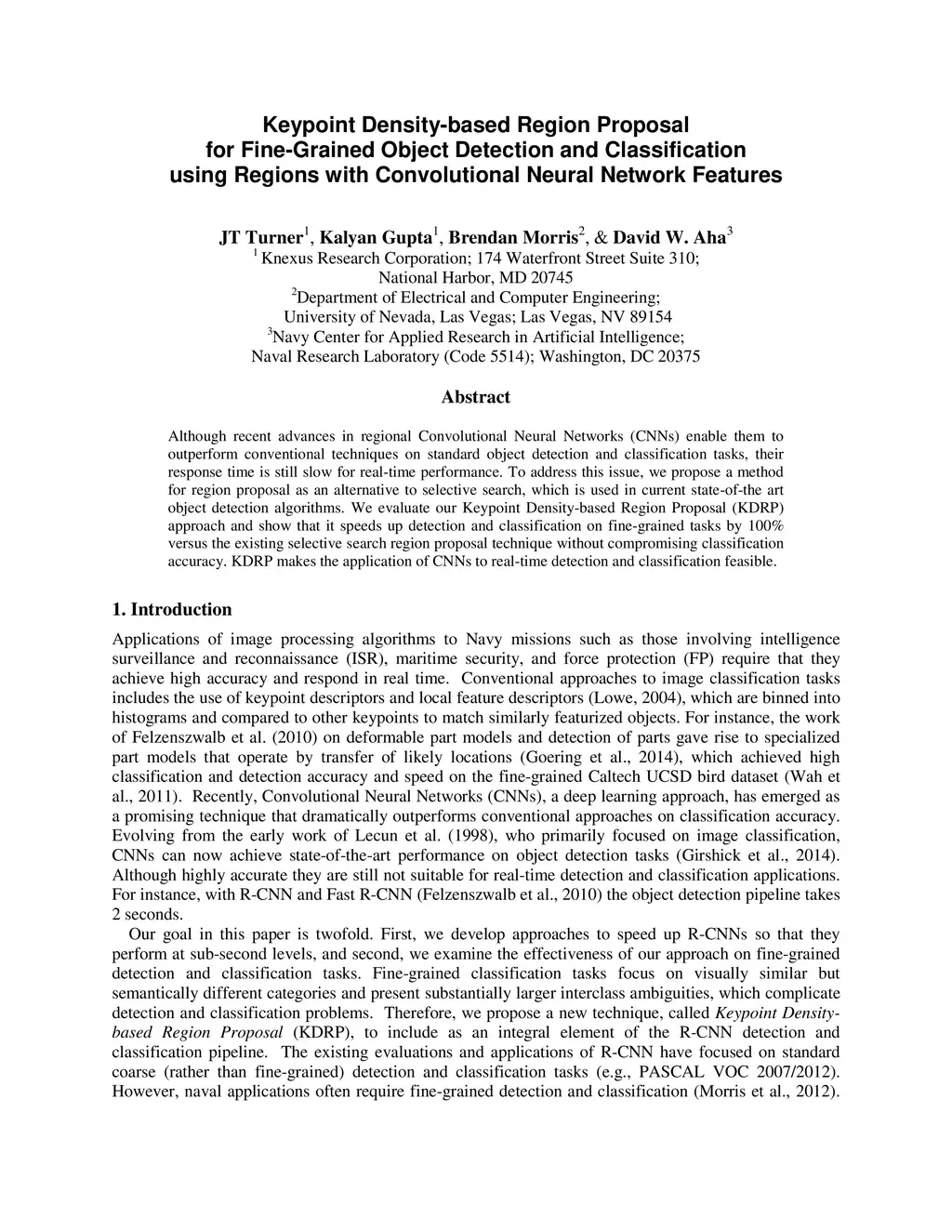 Although recent advances in regional Convolutional Neural Networks (CNNs) enable them to outperform conventional techniques on standard object detection and classification tasks, their response time is still slow for real-time performance. To address this issue, we propose a method for region proposal as an alternative to selective search, which is used in current state-of-the art object detection algorithms. We evaluate our Keypoint Density-based Region Proposal (KDRP) approach and show that it speeds up detection and classification on fine-grained tasks by 100% versus the existing selective search region proposal technique without compromising classification accuracy. KDRP makes the application of CNNs to real-time detection and classification feasible.