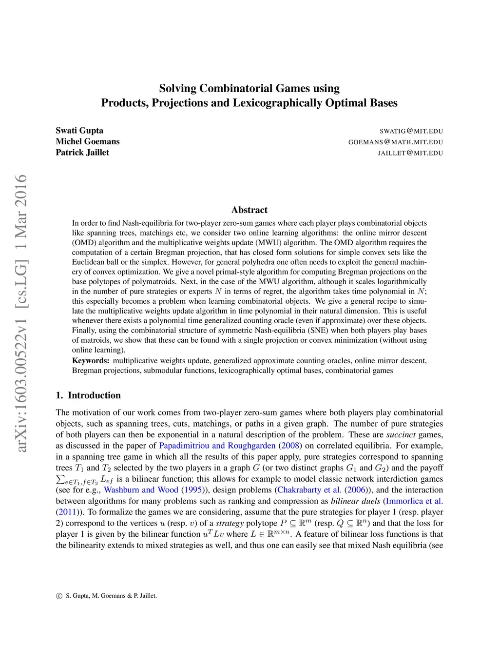 In order to find Nash-equilibria for two-player zero-sum games where each player plays combinatorial objects like spanning trees, matchings etc, we consider two online learning algorithms: the online mirror descent (OMD) algorithm and the multiplicative weights update (MWU) algorithm. The OMD algorithm requires the computation of a certain Bregman projection, that has closed form solutions for simple convex sets like the Euclidean ball or the simplex. However, for general polyhedra one often needs to exploit the general machinery of convex optimization. We give a novel primal-style algorithm for computing Bregman projections on the base polytopes of polymatroids. Next, in the case of the MWU algorithm, although it scales logarithmically in the number of pure strategies or experts in terms of regret, the algorithm takes time polynomial in ; this especially becomes a problem when learning combinatorial objects. We give a general recipe to simulate the multiplicative weights update algorithm in time polynomial in their natural dimension. This is useful whenever there exists a polynomial time generalized counting oracle (even if approximate) over these objects. Finally, using the combinatorial structure of symmetric Nash-equilibria (SNE) when both players play bases of matroids, we show that these can be found with a single projection or convex minimization (without using online learning).