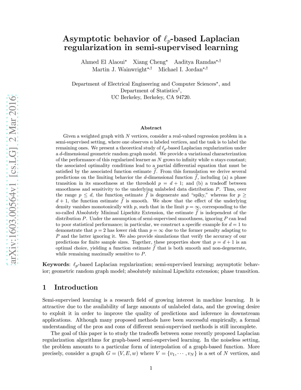 Given a weighted graph with vertices, consider a real-valued regression problem in a semi-supervised setting, where one observes labeled vertices, and the task is to label the remaining ones. We present a theoretical study of -based Laplacian regularization under a -dimensional geometric random graph model. We provide a variational characterization of the performance of this regularized learner as grows to infinity while stays constant, the associated optimality conditions lead to a partial differential equation that must be satisfied by the associated function estimate . From this formulation we derive several predictions on the limiting behavior the -dimensional function , including (a) a phase transition in its smoothness at the threshold , and (b) a tradeoff between smoothness and sensitivity to the underlying unlabeled data distribution . Thus, over the range , the function estimate is degenerate and "spiky," whereas for , the function estimate is smooth. We show that the effect of the underlying density vanishes monotonically with , such that in the limit , corresponding to the so-called Absolutely Minimal Lipschitz Extension, the estimate is independent of the distribution . Under the assumption of semi-supervised smoothness, ignoring can lead to poor statistical performance, in particular, we construct a specific example for to demonstrate that has lower risk than due to the former penalty adapting to and the latter ignoring it. We also provide simulations that verify the accuracy of our predictions for finite sample sizes. Together, these properties show that is an optimal choice, yielding a function estimate that is both smooth and non-degenerate, while remaining maximally sensitive to .