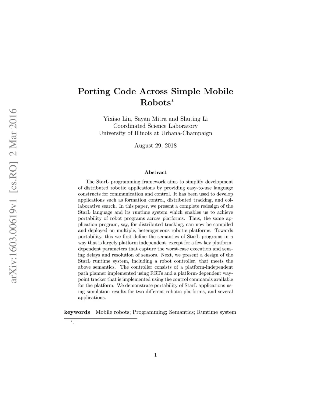 The StarL programming framework aims to simplify development of distributed robotic applications by providing easy-to-use language constructs for communication and control. It has been used to develop applications such as formation control, distributed tracking, and collaborative search. In this paper, we present a complete redesign of the StarL language and its runtime system which enables us to achieve portability of robot programs across platforms. Thus, the same application program, say, for distributed tracking, can now be compiled and deployed on multiple, heterogeneous robotic platforms. Towards portability, this we first define the semantics of StarL programs in a way that is largely platform independent, except for a few key platform-dependent parameters that capture the worst-case execution and sensing delays and resolution of sensors. Next, we present a design of the StarL runtime system, including a robot controller, that meets the above semantics. The controller consists of a platform-independent path planner implemented using RRTs and a platform-dependent way-point tracker that is implemented using the control commands available for the platform. We demonstrate portability of StarL applications using simulation results for two different robotic platforms, and several applications.