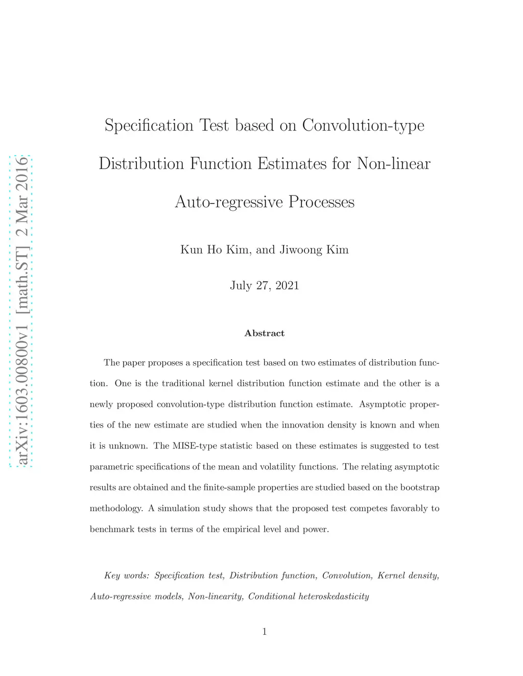 The paper proposes a specification test based on two estimates of distribution function. One is the traditional kernel distribution function estimate and the other is a newly proposed convolution-type distribution function estimate. Asymptotic properties of the new estimate are studied when the innovation density is known and when it is unknown. The MISE-type statistic based on these estimates is suggested to test parametric specifications of the mean and volatility functions. The relating asymptotic results are obtained and the finite-sample properties are studied based on the bootstrap methodology. A simulation study shows that the proposed test competes favorably to benchmark tests in terms of the empirical level and power.