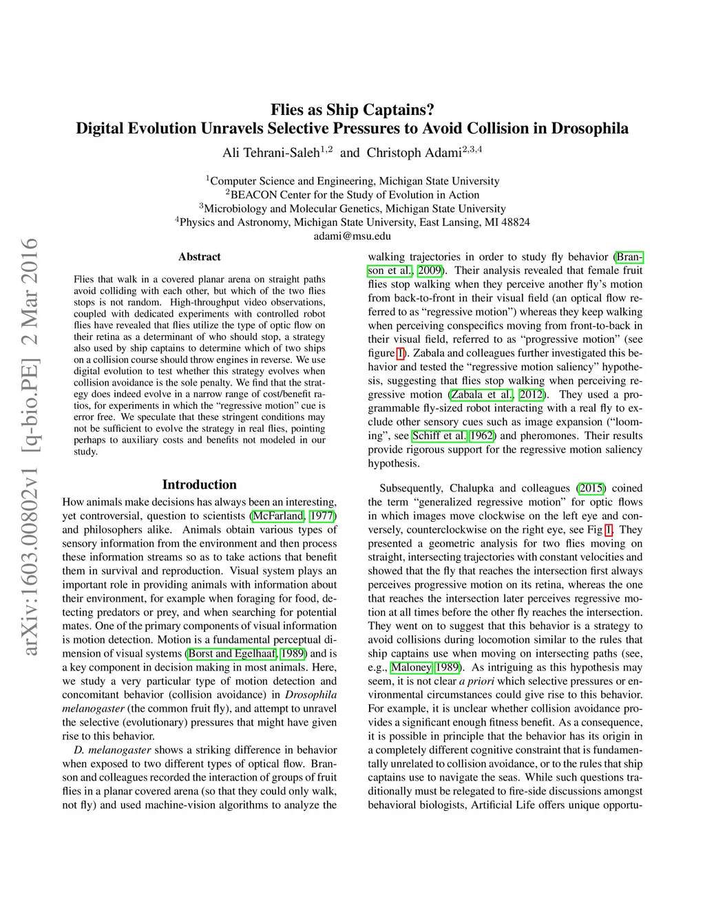 Flies that walk in a covered planar arena on straight paths avoid colliding with each other, but which of the two flies stops is not random. High-throughput video observations, coupled with dedicated experiments with controlled robot flies have revealed that flies utilize the type of optic flow on their retina as a determinant of who should stop, a strategy also used by ship captains to determine which of two ships on a collision course should throw engines in reverse. We use digital evolution to test whether this strategy evolves when collision avoidance is the sole penalty. We find that the strategy does indeed evolve in a narrow range of cost/benefit ratios, for experiments in which the "regressive motion" cue is error free. We speculate that these stringent conditions may not be sufficient to evolve the strategy in real flies, pointing perhaps to auxiliary costs and benefits not modeled in our study