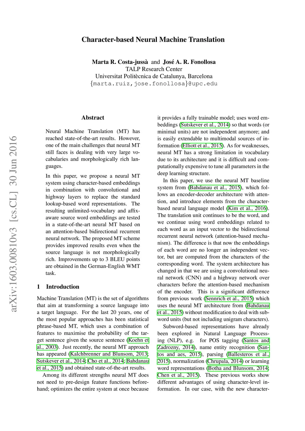 Neural Machine Translation (MT) has reached state-of-the-art results. However, one of the main challenges that neural MT still faces is dealing with very large vocabularies and morphologically rich languages. In this paper, we propose a neural MT system using character-based embeddings in combination with convolutional and highway layers to replace the standard lookup-based word representations. The resulting unlimited-vocabulary and affix-aware source word embeddings are tested in a state-of-the-art neural MT based on an attention-based bidirectional recurrent neural network. The proposed MT scheme provides improved results even when the source language is not morphologically rich. Improvements up to 3 BLEU points are obtained in the German-English WMT task.