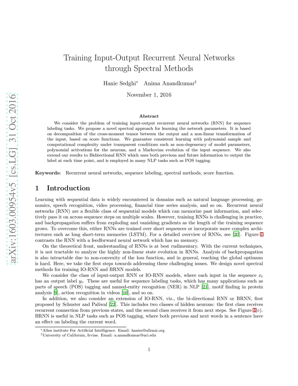 We consider the problem of training input-output recurrent neural networks (RNN) for sequence labeling tasks. We propose a novel spectral approach for learning the network parameters. It is based on decomposition of the cross-moment tensor between the output and a non-linear transformation of the input, based on score functions. We guarantee consistent learning with polynomial sample and computational complexity under transparent conditions such as non-degeneracy of model parameters, polynomial activations for the neurons, and a Markovian evolution of the input sequence. We also extend our results to Bidirectional RNN which uses both previous and future information to output the label at each time point, and is employed in many NLP tasks such as POS tagging.