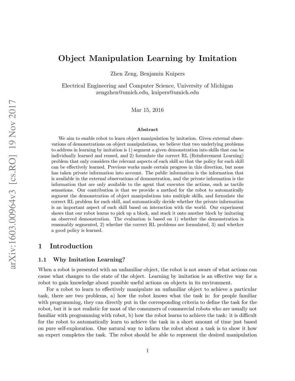 We aim to enable robot to learn object manipulation by imitation. Given external observations of demonstrations on object manipulations, we believe that two underlying problems to address in learning by imitation is 1) segment a given demonstration into skills that can be individually learned and reused, and 2) formulate the correct RL (Reinforcement Learning) problem that only considers the relevant aspects of each skill so that the policy for each skill can be effectively learned. Previous works made certain progress in this direction, but none has taken private information into account. The public information is the information that is available in the external observations of demonstration, and the private information is the information that are only available to the agent that executes the actions, such as tactile sensations. Our contribution is that we provide a method for the robot to automatically segment the demonstration of object manipulations into multiple skills, and formulate the correct RL problem for each skill, and automatically decide whether the private information is an important aspect of each skill based on interaction with the world. Our experiment shows that our robot learns to pick up a block, and stack it onto another block by imitating an observed demonstration. The evaluation is based on 1) whether the demonstration is reasonably segmented, 2) whether the correct RL problems are formulated, 3) and whether a good policy is learned.
