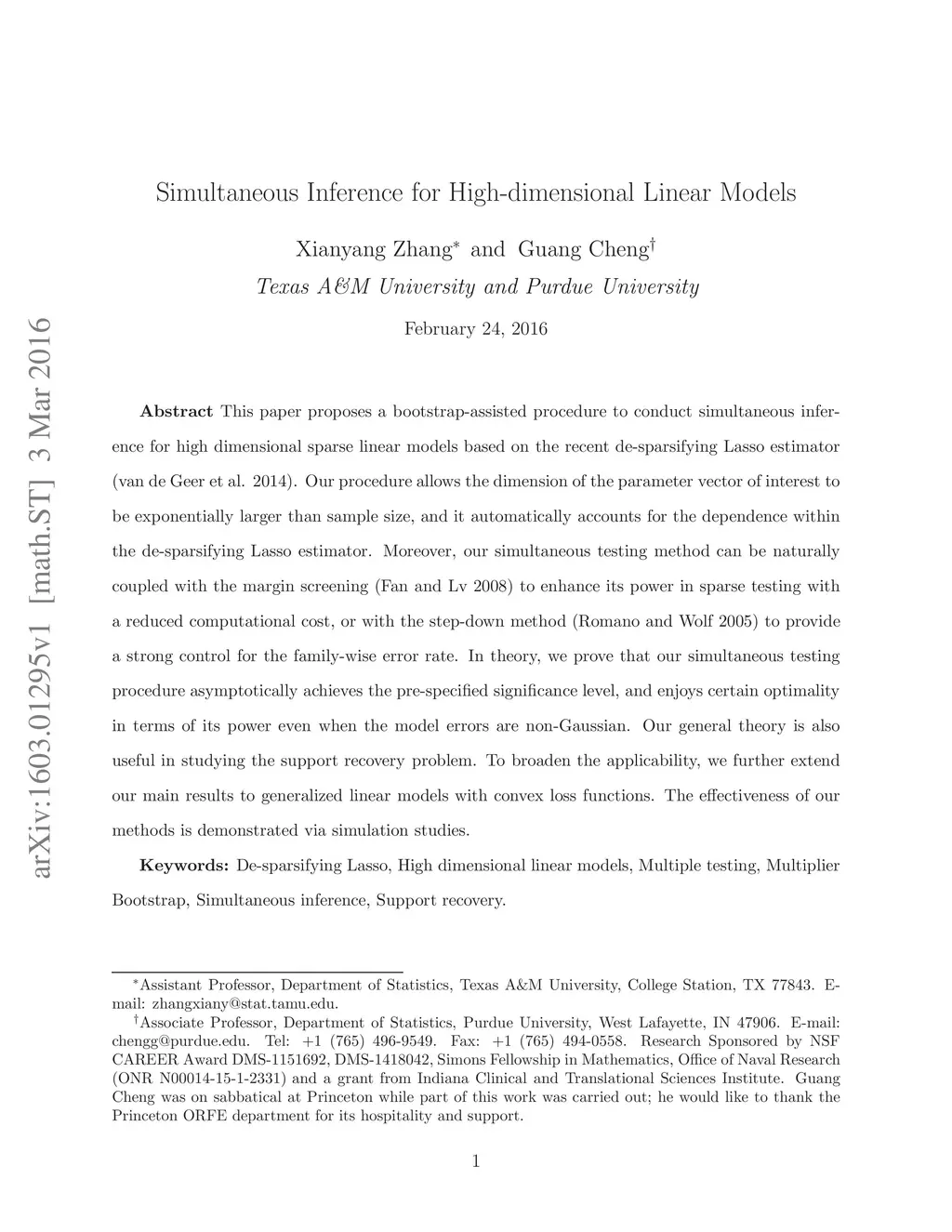 This paper proposes a bootstrap-assisted procedure to conduct simultaneous inference for high dimensional sparse linear models based on the recent de-sparsifying Lasso estimator (van de Geer et al. 2014). Our procedure allows the dimension of the parameter vector of interest to be exponentially larger than sample size, and it automatically accounts for the dependence within the de-sparsifying Lasso estimator. Moreover, our simultaneous testing method can be naturally coupled with the margin screening (Fan and Lv 2008) to enhance its power in sparse testing with a reduced computational cost, or with the step-down method (Romano and Wolf 2005) to provide a strong control for the family-wise error rate. In theory, we prove that our simultaneous testing procedure asymptotically achieves the pre-specified significance level, and enjoys certain optimality in terms of its power even when the model errors are non-Gaussian. Our general theory is also useful in studying the support recovery problem. To broaden the applicability, we further extend our main results to generalized linear models with convex loss functions. The effectiveness of our methods is demonstrated via simulation studies.