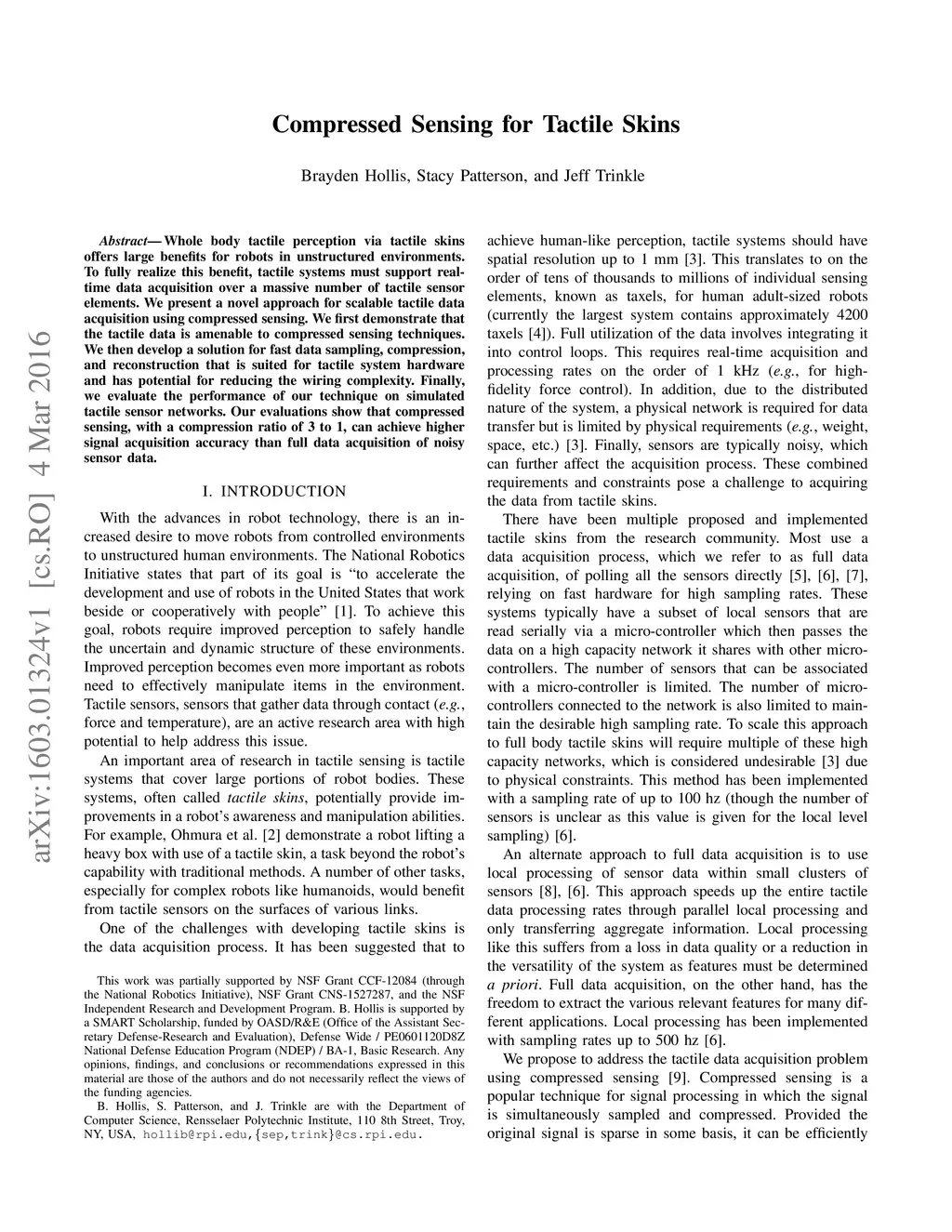 Whole body tactile perception via tactile skins offers large benefits for robots in unstructured environments. To fully realize this benefit, tactile systems must support real-time data acquisition over a massive number of tactile sensor elements. We present a novel approach for scalable tactile data acquisition using compressed sensing. We first demonstrate that the tactile data is amenable to compressed sensing techniques. We then develop a solution for fast data sampling, compression, and reconstruction that is suited for tactile system hardware and has potential for reducing the wiring complexity. Finally, we evaluate the performance of our technique on simulated tactile sensor networks. Our evaluations show that compressed sensing, with a compression ratio of 3 to 1, can achieve higher signal acquisition accuracy than full data acquisition of noisy sensor data.