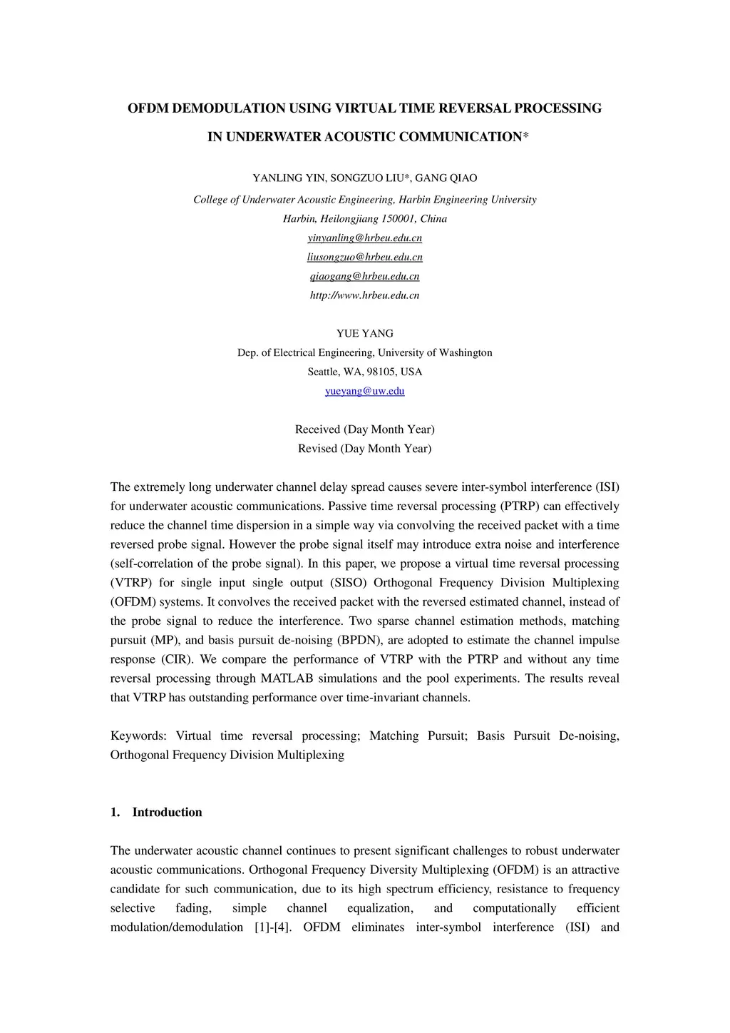 OFDM demodulation using virtual time reversal processing in underwater