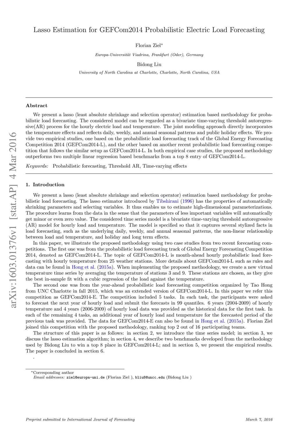 Lasso estimation for GEFCom2014 probabilistic electric load forecasting