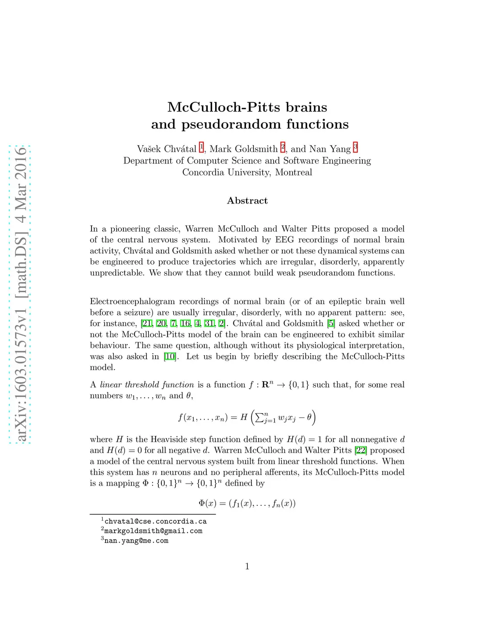 In a pioneering classic, Warren McCulloch and Walter Pitts proposed a model of the central nervous system. Motivated by EEG recordings of normal brain activity, Chv\átal and Goldsmith asked whether or not these dynamical systems can be engineered to produce trajectories which are irregular, disorderly, apparently unpredictable. We show that they cannot build weak pseudorandom functions.