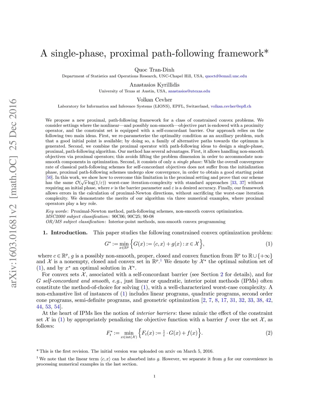 We propose a new proximal, path-following framework for a class of constrained convex problems. We consider settings where the nonlinear---and possibly non-smooth---objective part is endowed with a proximity operator, and the constraint set is equipped with a self-concordant barrier. Our approach relies on the following two main ideas. First, we re-parameterize the optimality condition as an auxiliary problem, such that a good initial point is available; by doing so, a family of alternative paths towards the optimum is generated. Second, we combine the proximal operator with path-following ideas to design a single-phase, proximal, path-following algorithm. Our method has several advantages. First, it allows handling non-smooth objectives via proximal operators; this avoids lifting the problem dimension in order to accommodate non-smooth components in optimization. Second, it consists of only a \emph{single phase}: While the overall convergence rate of classical path-following schemes for self-concordant objectives does not suffer from the initialization phase, proximal path-following schemes undergo slow convergence, in order to obtain a good starting point \cite{TranDinh2013e}. In this work, we show how to overcome this limitation in the proximal setting and prove that our scheme has the same worst-case iteration-complexity with standard approaches \cite{Nesterov2004,Nesterov1994} without requiring an initial phase, where is the barrier parameter and is a desired accuracy. Finally, our framework allows errors in the calculation of proximal-Newton directions, without sacrificing the worst-case iteration complexity. We demonstrate the merits of our algorithm via three numerical examples, where proximal operators play a key role.