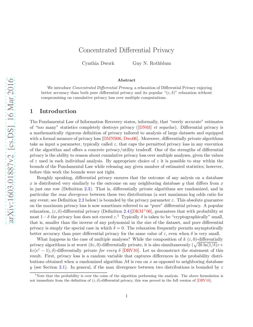 We introduce Concentrated Differential Privacy, a relaxation of Differential Privacy enjoying better accuracy than both pure differential privacy and its popular "(epsilon,delta)" relaxation without compromising on cumulative privacy loss over multiple computations.
