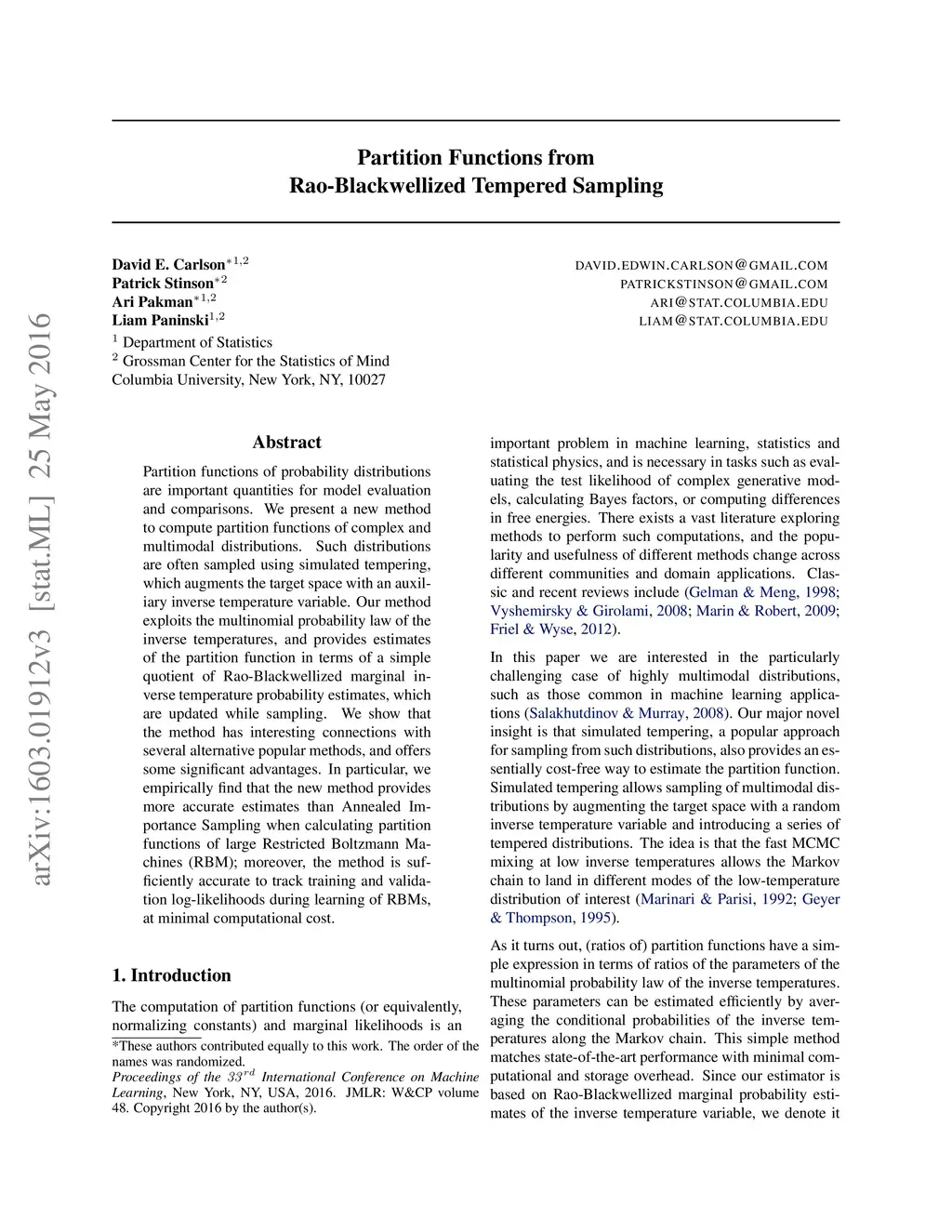 Partition functions of probability distributions are important quantities for model evaluation and comparisons. We present a new method to compute partition functions of complex and multimodal distributions. Such distributions are often sampled using simulated tempering, which augments the target space with an auxiliary inverse temperature variable. Our method exploits the multinomial probability law of the inverse temperatures, and provides estimates of the partition function in terms of a simple quotient of Rao-Blackwellized marginal inverse temperature probability estimates, which are updated while sampling. We show that the method has interesting connections with several alternative popular methods, and offers some significant advantages. In particular, we empirically find that the new method provides more accurate estimates than Annealed Importance Sampling when calculating partition functions of large Restricted Boltzmann Machines (RBM); moreover, the method is sufficiently accurate to track training and validation log-likelihoods during learning of RBMs, at minimal computational cost.